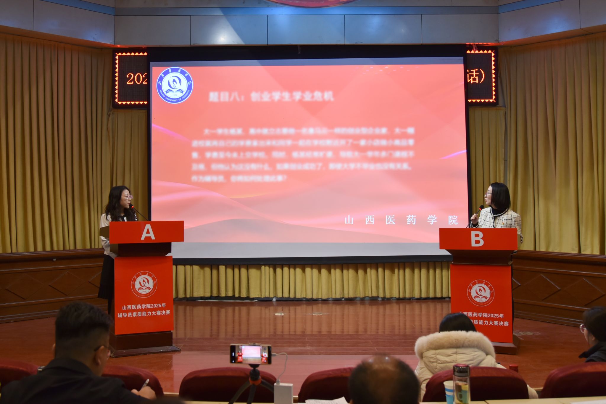 决赛设置谈心谈话与案例研讨两大核心环节,全方位考察辅导员思想政治教育、价值引领及实战综合能力。谈心谈话环节,选手面对学业焦虑、心理困惑、就业指导等情景再现的场景,以制度运用和共情倾听为基础,运用专业方法引导学生化解矛盾,展现“知心朋友”的温度与智慧;案例研讨环节,参赛选手以“我提问,你回答”的方式围绕案例,深入剖析、精准阐述,提出系统性解决方案,体现“人生导师”的专业素养与应急处置能力。
