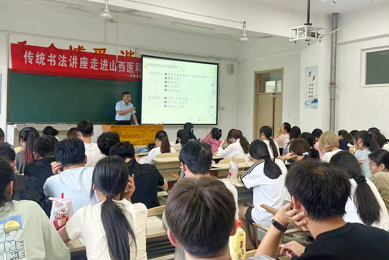 为弘扬中华优秀传统文化,提高大学生对书法艺术的认知与兴趣,5月22日下午,医学影像系联合汾阳市文化馆开展传统文化进班级活动,邀请汾阳市政协社情民意信息中心主任、吕梁市青年书协副主席、山西省青年书法家协会理事郭晓峰为医学影像系82301-2班同学带来了一场视听盛宴——《兰亭序》天下第一行书赏析。