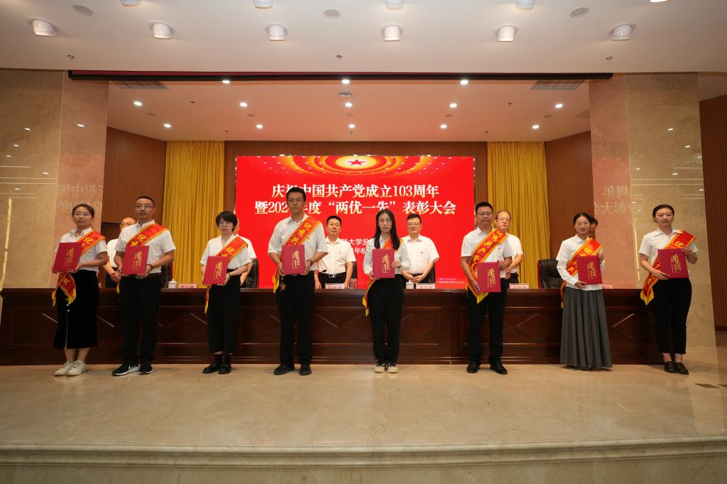 党委书记闫敬来代表校党委向受表彰的集体和个人表示祝贺,向全校各级党组织和全体共产党员致以节日的问候,带领大家回顾了中国共产党103年的光辉历程,强调了纪律的重要性,为全体党员上了一堂生动的纪律党课。他指出,严明的纪律始终是我党独特的政治优势和一以贯之的优良传统,扎实开展党纪学习教育。他要求,全校各级党组织和全体共产党员,一要严守政治纪律,做政治坚定的“明白人”。准确把握、严格执行党的政治纪律,持续巩固拓展学习贯彻习近平新时代中国特色社会主义思想主题教育成果。在坚定拥护“两个确立”、坚决做到“两个维护”上做表率。二要严守组织纪律,做言行一致的“老实人”。要牢记第一身份是共产党员,第一职责是为党工作。做到言行一致、表里如一。三要严守廉洁纪律,做严于律己的“规矩人”。要坚持正确用权取向,自觉接受各方面监督。带头践行廉洁自律规范,持续筑牢拒腐防变“防火墙”。四要严守群众纪律,做服务师生的“贴心人”。要牢固树立“以学生为中心,以教师为主体,以教学为根本”的办学理念,持续深入开展“我为群众办实事”活动,持续改进工作作风。五要严守工作纪律,做履职尽责的“担当人”。当前学校改革发展任务艰巨,要抓住机遇、迎接挑战,把责任扛起来,真抓实干、担当作为,不折不扣贯彻落实学校党委各项决策部署。六要严守生活纪律,做品行高尚的“正派人”。要继承和弘扬革命前辈的红色家风,以反面典型为戒。用实际行动锻造高尚的精神境界。