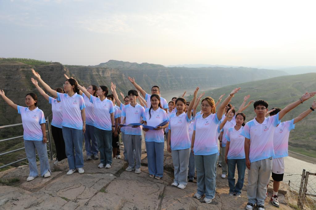 山路蜿蜒,实践团来到了位于石楼县辛关镇马家畔村的黄河奇湾。奔腾的黄河水一路南行,在这里突然向东拐了一个奇特的大弯。队员们领略着母亲河的壮观,实地感受红军东征的壮举,集体朗诵了《沁园春·雪》,团委李凯老师还演唱了《沁园春·雪》,表达了对祖国壮丽河山的无比热爱。