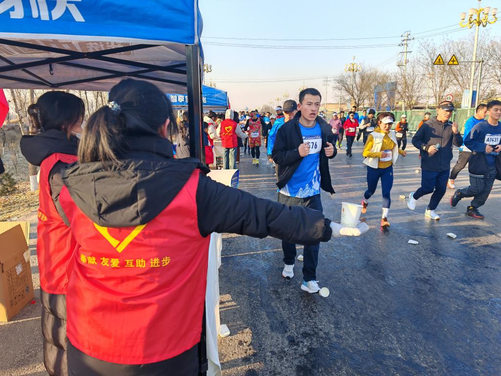 比赛开始后,沿着赛道,每隔一段距离就有志愿者驻守,为选手递上饮用水和补给物,并为他们加油助威。