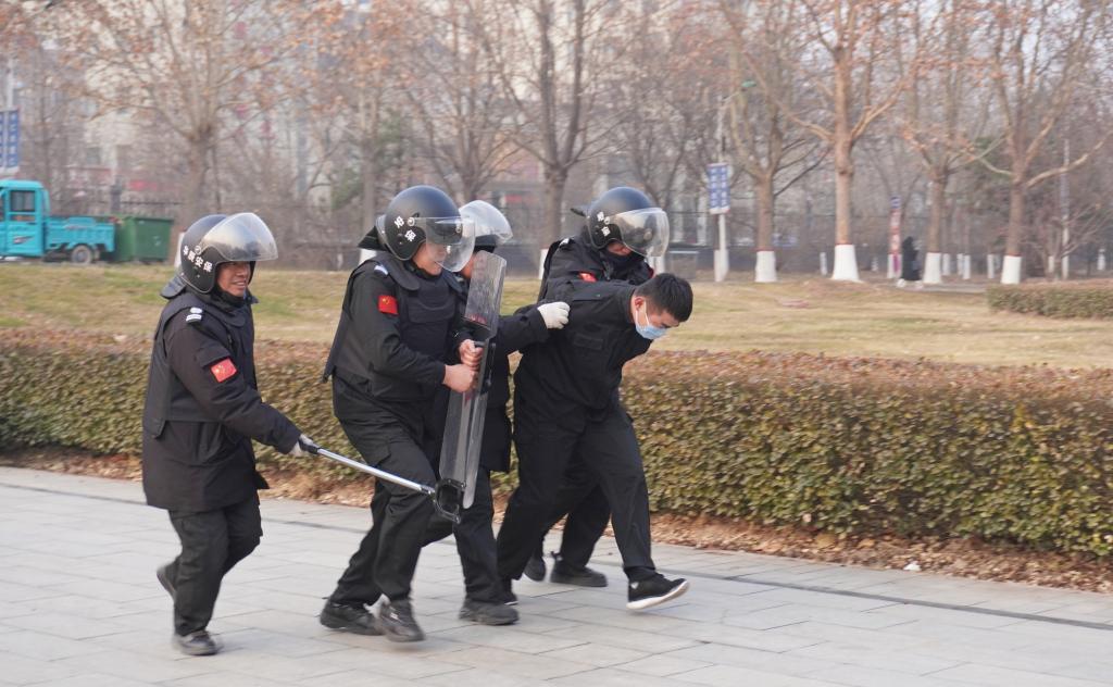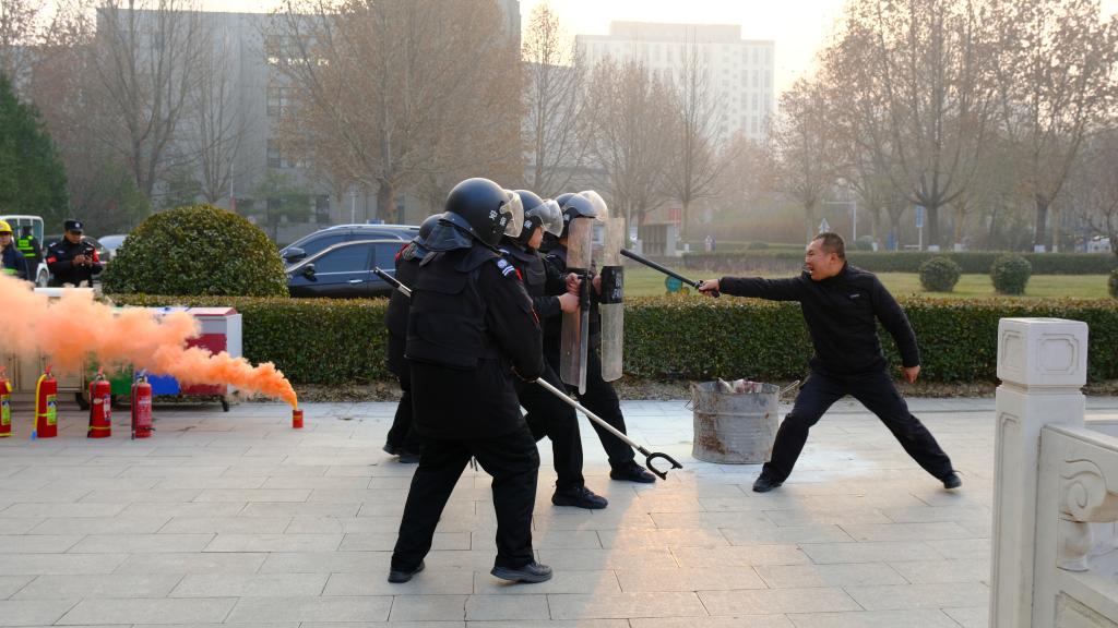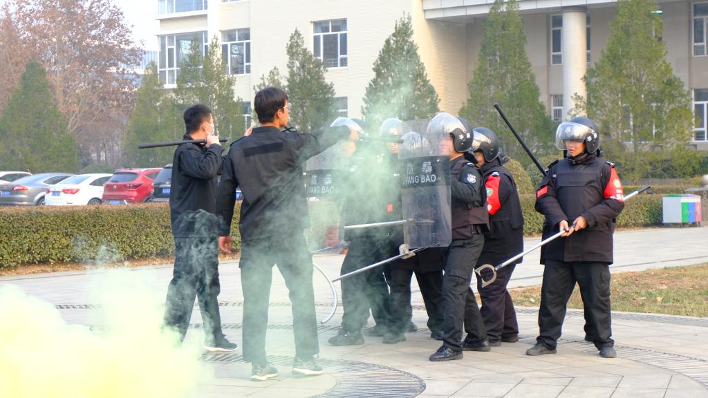 演练中,校门口安保人员阻止“暴恐分子”进入校园,同时监控室及时报告异常情况,保卫处迅速出动,疏散师生,组织安保人员战术列阵,对闯入校园的“暴恐分子”形成压制,有效控制,等待警方力量抵达,最终抓捕“暴恐分子”,恢复校园安宁的正常秩序。