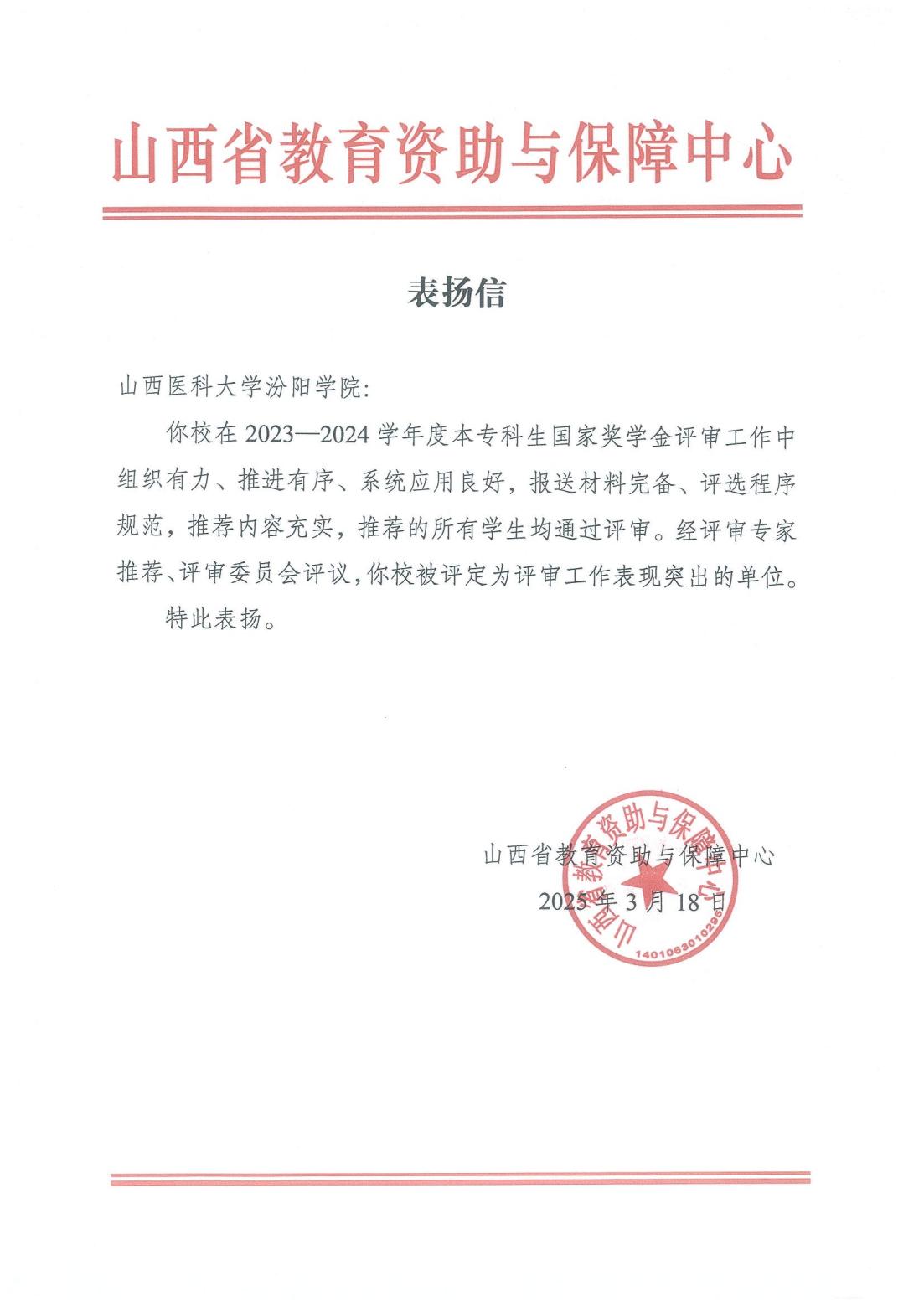 近日,beat365收到山西省教育资助与保障中心发来的表扬信。信中指出,beat365在2023-2024学年度国家奖学金评审工作中组织有力、推进有序、系统应用良好,报送材料完备、评选程序规范、推荐内容充实,推荐的所有学生均通过评审。beat365被评定为评审工作表现突出单位。