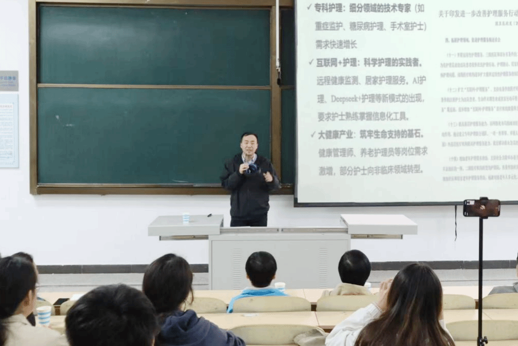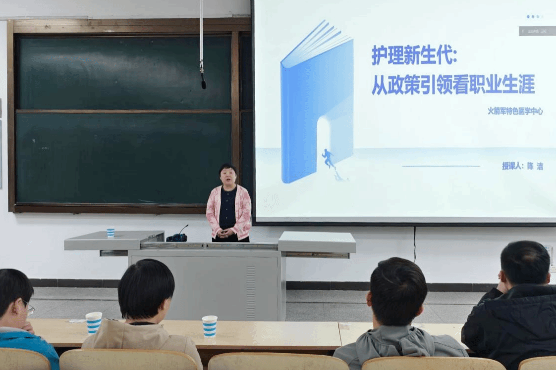 陈洁老师围绕护理职业发展展开了全面深入的讲授。她首先通过视频展示了火箭军特色医学中心的风貌,激发学生对护理职业的热情。她强调,护理职业不仅仅是谋生手段,而是实现人生价值的舞台,建议同学们明确职业目标并制定科学规划。她将护士职业发展路径分为探索期、创立期和成熟期三个阶段,并通过真实案例为学生提供借鉴,鼓励同学们综合横向与纵向发展。在政策解读方面,陈洁老师结合我国人口老龄化的社会背景,详细分析了国家医养结合政策为护理专业带来的广阔就业空间,她指出护理人才缺口大,发展潜力无限。此外,在护理科研方面,她强调科研应立足临床有效性,推动学科进步。最后,陈洁老师勉励同学们要抓住政策机遇,持续提升发展,实现职业目标与自我价值。