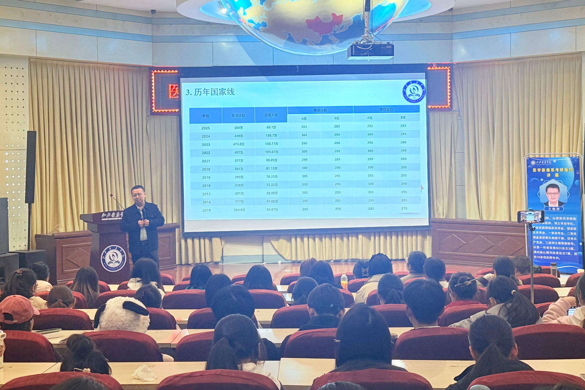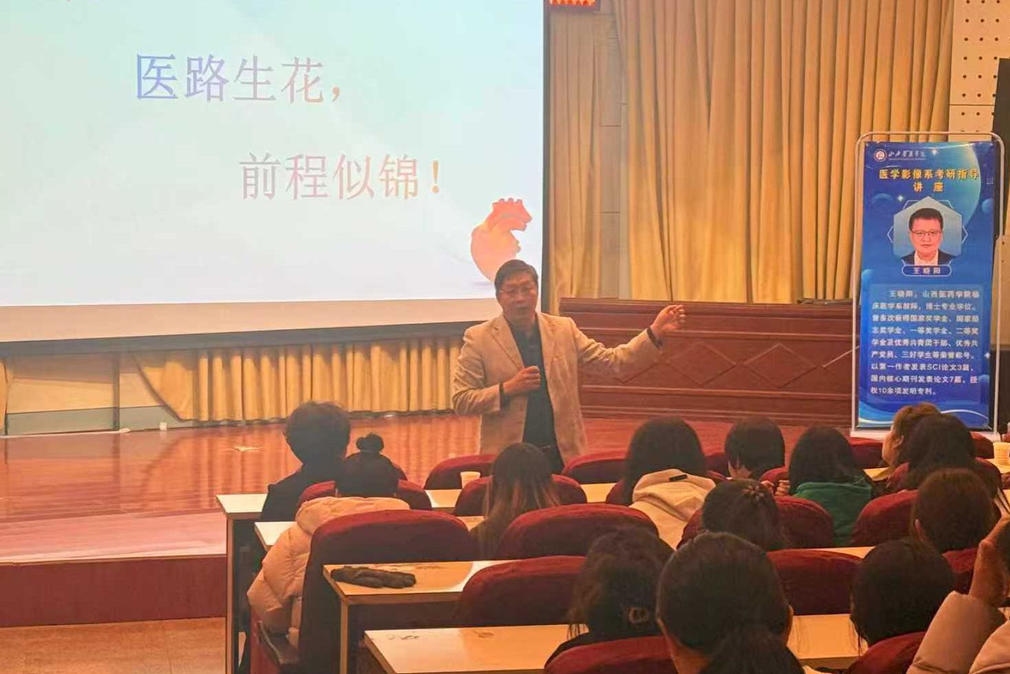 在10月15日孝义校区讲座中,王晓阳老师结合医学影像技术专业的特点与发展趋势,为新生们详细讲述了大学期间各个阶段的学习重点,强调了学业目标与基础积累的重要性,希望同学们学好生理、生化、病理等课程,为后续专业学习和考研笔试的打牢基础,鼓励新生积极参加科研与实践,拓宽视野,培养沟通能力与团队协作精神,为考研复试提前储能。最后,进行了升学规划和就业路径指导,为新生指明了学习的方向。
