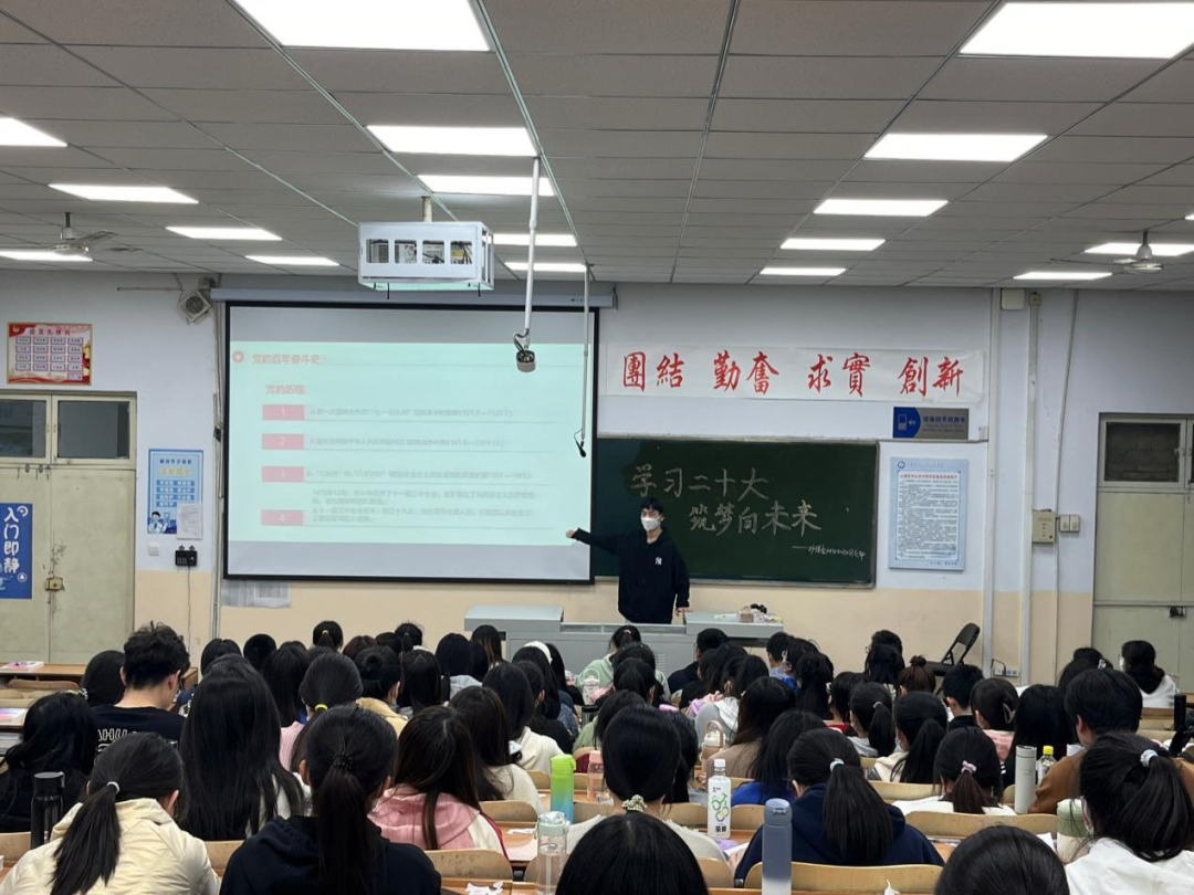 百年征程波澜壮阔,百年初心历久弥坚。前进的号角已经吹响,壮丽的事业激励着我们继往开来。宋鑫雨同学带领同学们共同回顾了党的二十大的主要内容:过去十年我们党做了什么?未来要做什么?要坚持和加强党中央集中统一领导,坚持不懈用新时代中国特色社会主义思想凝心铸魂。2012年至2022年,十年砥砺奋进,中国共产党给中国人民交出了彪炳史册的时代答卷。从党史看,这是矢志不渝践行初心使命的十年;从新中国史看,这是滚石上山走向"强起来"的十年;从改革开放史看,这是全面深化改革不断向广度和深度进军的十年;从社会主义发展史看,这是展现马克思主义真理日新月异的国家,亿万满怀信心的人民欣逢盛世,不胜感怀。我国国际地位不断提高,国际事务话语权不断提升,人民群众的获得感,幸福感不断提升,“我们生在红旗下,长在春风里,人民有信仰,国家有力量,民族有希望,目光所至皆为华夏,五星闪耀皆为信仰。愿以吾辈之青春,捍卫盛世之中华”是我们这一代青年人的心声。