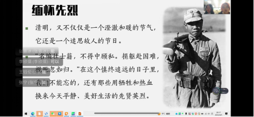 随后主持人牛颖童通过视频与文字相结合的方式,以“缅怀英烈”为契机向大家介绍了多位耳熟能详的革命先烈及他们的英雄事迹,用“四史”阐释革命英烈“精忠报国”的爱国精神、“砍头不要紧,只要主义真”的精神信仰、“死在戈壁滩,埋在青山头”的奉献精神,如刘胡兰——“生的伟大,死的光荣”、董存瑞——“舍身炸碉堡”等,增进了同学们对革命先烈的感恩与敬仰,纷纷表示要以革命先辈为榜样,继承他们的遗志,珍惜当下来之不易的幸福生活,为实现中华民族的伟大复兴贡献自己的力量。