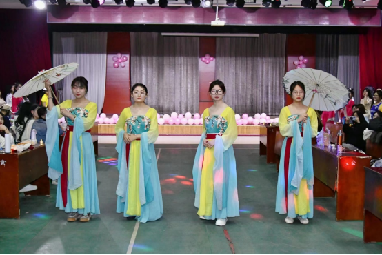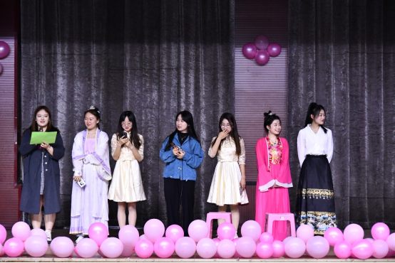 在大家兴致正浓时,张若涵宿舍带来的小品《唐朝美人》缓缓登上舞台,从当代女性的容貌焦虑入手,以古代场景为辅,诙谐幽默,旨在揭示每个人都有自己魅力,可以是朝阳的向日葵,也可以是暗夜的玫瑰,大众的偏见无法还原真正的你,狭隘的定义无法决定怎样的你。活动的压轴表演为“豆蔻青春,衣华独秀”大型走秀节目,共80多人参与,有礼服组、运动组、古风组、休闲组、西服组等,风格迥异。我们生活在张扬个性的年代,舞台中央灯光闪耀,映照着同学们明媚的洋溢着笑容的脸庞,朝气盎然,律动中充溢着自信,展现了青春风姿。每个小组之间的默契配合,提升了班集体的团结意识,展现了同学们自信热血的精神风貌。