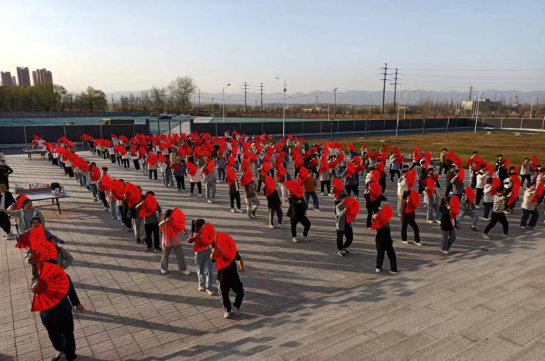 首先太极扇呈现的图形是党徽,它代表我们国家由中国共产党领导,从开天辟地、改天换地、翻天覆地再到惊天动地的伟大变化,让我们把党牢记心中!