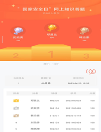 第二,我系学生会于2023年4月20日面向系全体学生开展国家安全知识竞赛活动。本次活动以线上竞赛答题形式开展,共计十五题,答题正确率高且所用时间较短者排名靠前。活动过程中,学生们踊跃参加,认真答题,正确率较高,有效践行了“将国家安全教育纳入国民教育体系”的法定要求。