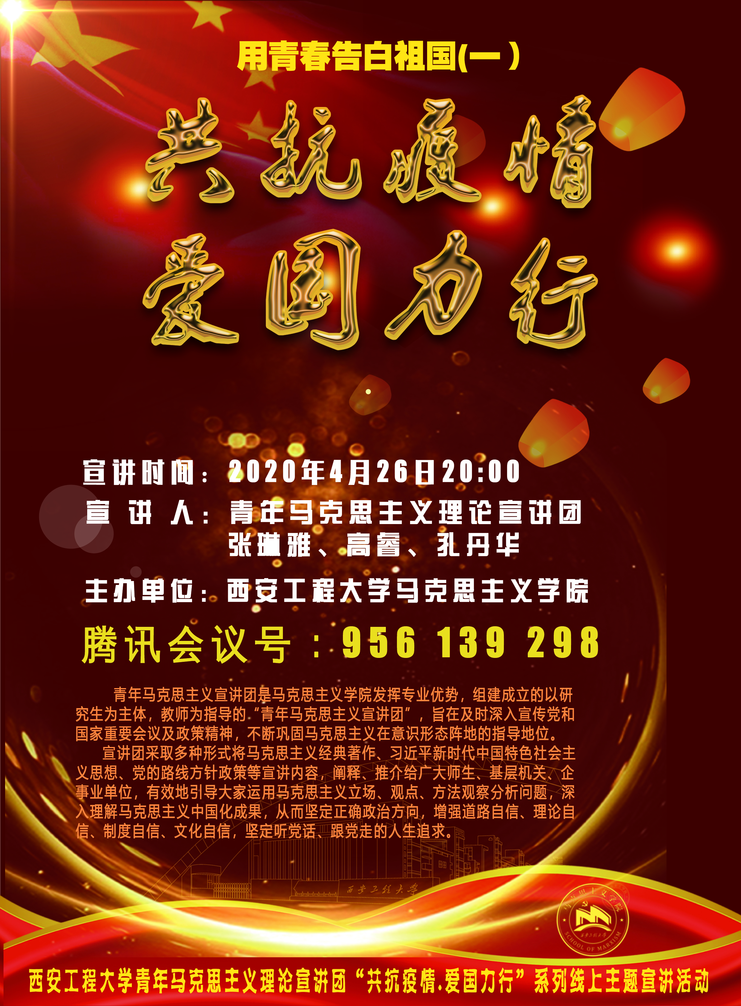 为进一步引导广大青年学习全国人民众志成城抗击疫情的伟大精神,通过疫情防控实践认知青年职责,大力弘扬新时代爱国主义精神,切实把思想和行动统一到习近平总书记关于疫情防控工作的重要讲话精神和党中央决策部署上来,引领凝聚广大青年落实各项疫情防控措施,为坚决打赢疫情防控阻击战贡献青春智慧和力量,必赢官网青年马克思主义理论宣讲团主动担当作为,组织开展“共抗疫情·爱国力行”系列线上主题宣讲活动。