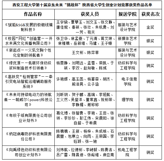 2020年9月11日,由团省委、省委教育工委、省科协、省社会科学院、省学联共同主办,西安翻译学院承办的第十届京东未来“挑战杯”陕西省大学生创业计划竞赛决赛闭幕式在西安翻译学院举行,必赢官网9件参赛作品获奖,其中金奖1件,银奖2件,铜奖6件,学校荣获赛事“优秀组织单位”荣誉称号。(获奖作品信息见附件)。