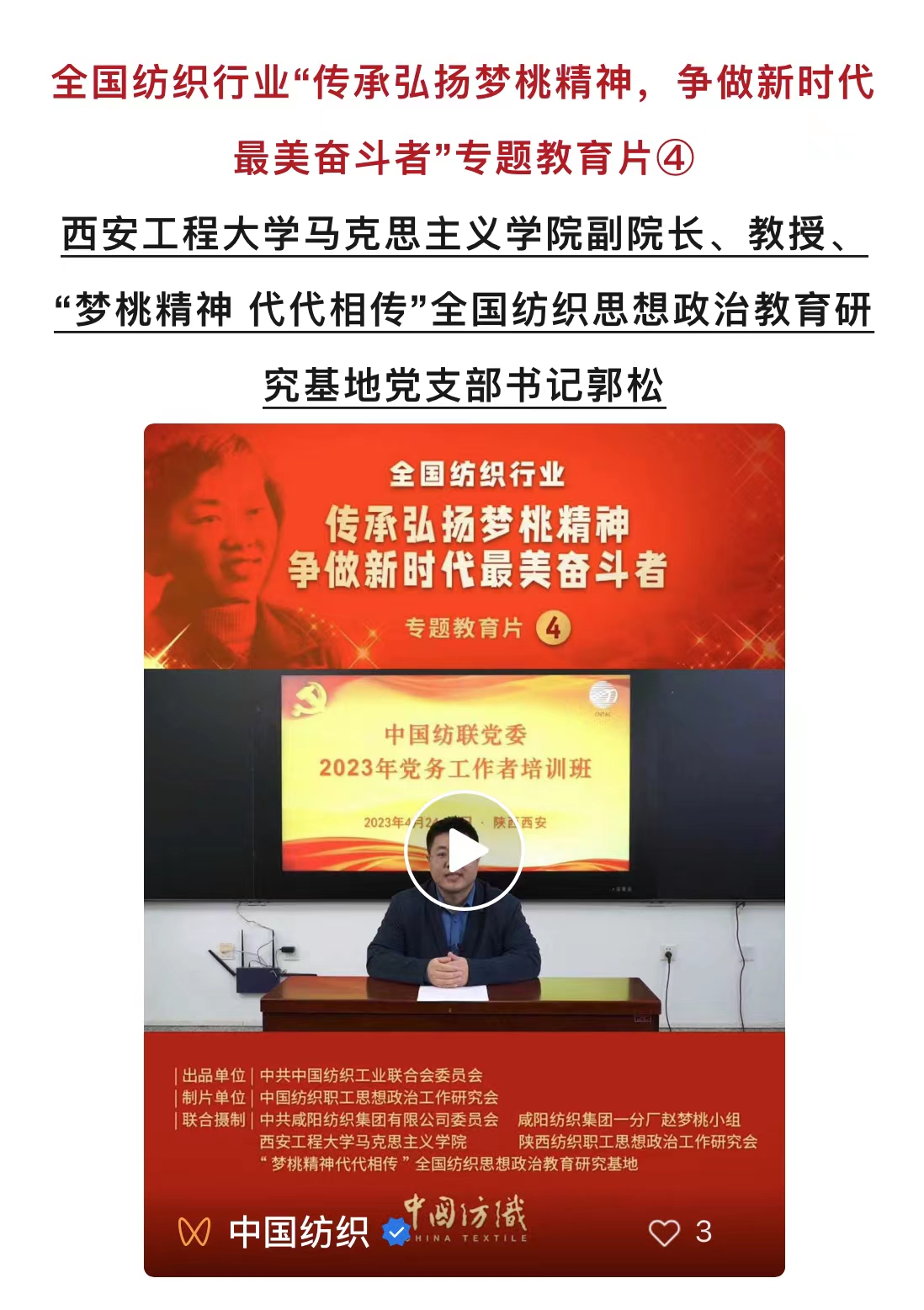 7月5日至6日,全国纺织行业党建工作经验交流会、全国纺织行业思想政治工作会、全国纺织劳动关系和谐企业推介大会暨中纺政研会五届四次理事会在吉林省吉林市召开,会议以“全面提升行业发展软实力、建设纺织现代化产业体系”为主题,旨在总结交流纺织行业党建工作经验,研讨传承行业思想政治工作优良传统、推动构建和谐劳动关系,促进行业提升发展软实力、实现高质量发展。必赢官网马克思主义学院“梦桃精神 代代相传”全国纺织思想政治教育研究基地被中国纺织工业联合会授予2022年度“全国纺织行业党建工作先进单位”;马克思主义学院副院长、“梦桃精神 代代相传”全国纺织思想政治教育师生党支部书记郭松被授予2022年度“全国纺织行业优秀思想政治工作者”;马克思主义学院“梦桃精神 代代相传”全国纺织思想政治教育研究基地参与摄制的“传承弘扬梦桃精神 争做新时代最美奋斗者”专题教育片在大会现场发布。