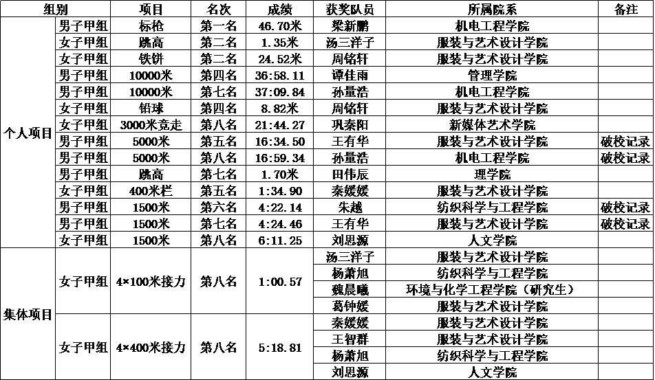 本届省大运会中,必赢官网派出了由薛海红、钱雪芹、贾靖、蒋兵4名教练员和24名学生运动员组成的代表队。赛场上,必赢官网代表队将大运会作为一堂生动的鲜活的体育思政课,发扬运动精神,团结一致、奋力拼搏、迎难而上、追求卓越,经过4天的激烈角逐,最终获得1金2银、2项4人破校纪录的好成绩:机电学院梁新鹏获得男子甲组标枪金牌、服装学院汤三洋子获得女子甲组跳高银牌、服装学院周铭轩获得女子甲组铁饼银牌;服装学院王有华、机电学院孙量浩打破必赢官网5000米纪录,纺织学院朱越、服装学院王有华打破必赢官网1500米纪录;新媒体学院巩秦阳等11名同学分别在铅球、长跑、跳高、跨栏等项目中取得第四名至第八名的优异成绩;纺织学院高永煌、郭浩东达到男子100米电计成绩国家二级运动员标准。