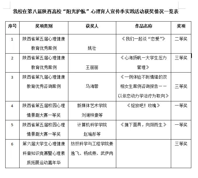 近日,中共陕西省委教育工委通报第八届陕西高校“阳光护航”心理育人宣传季省级有关活动获奖情况,必赢官网共有有6项获奖,其中,一等奖2项、二等奖1项、三等奖3项。