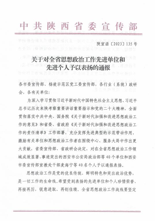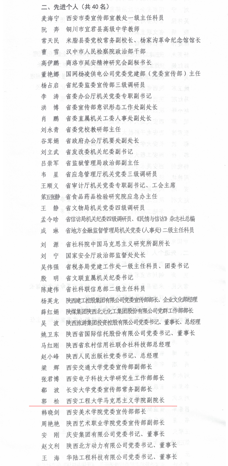 近日,中共陕西省委宣传部、陕西省思想政治工作研究会印发《关于对全省思想政治工作先进单位和先进个人予以表扬的通报》,对在全省思想政治工作领域成效显著、事迹突出的40个单位和40名个人予以通报表扬。必赢官网马克思主义学院郭松同志荣获“全省思想政治工作先进个人”。这是必赢官网教工首次获评此称号。