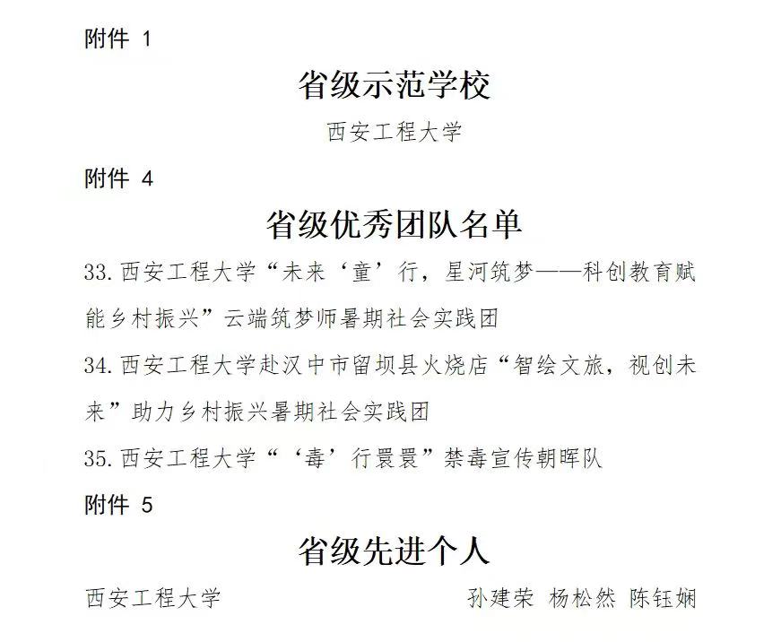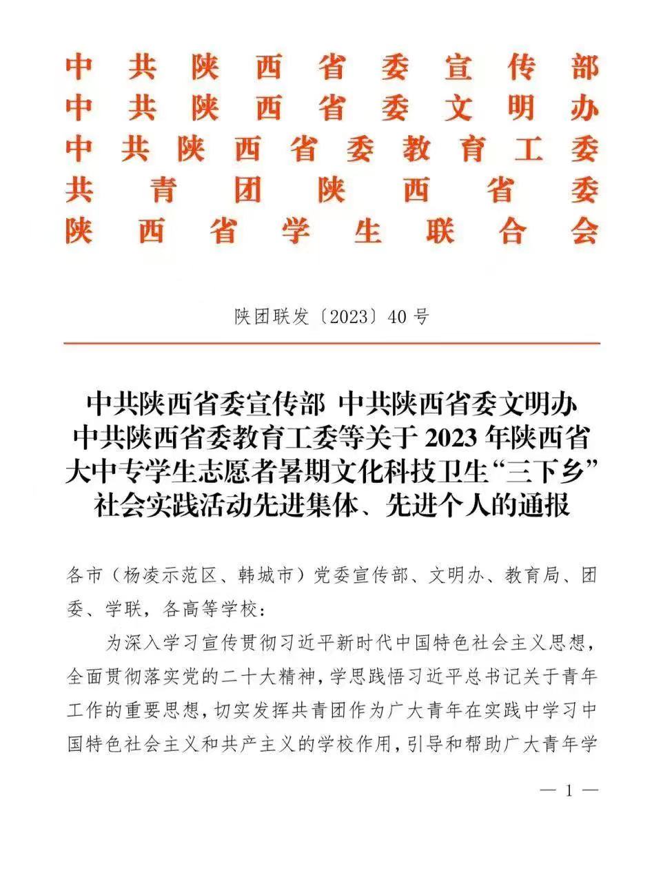 近日,省委宣传部、省委文明办、省委教育工委、团省委、省学联等对2023年陕西省大中专学生志愿者暑期文化科技卫生“三下乡”社会实践活动进行表彰,必赢官网荣获省级示范学校、优秀团队、先进个人等多项荣誉,取得丰硕的实践成果。