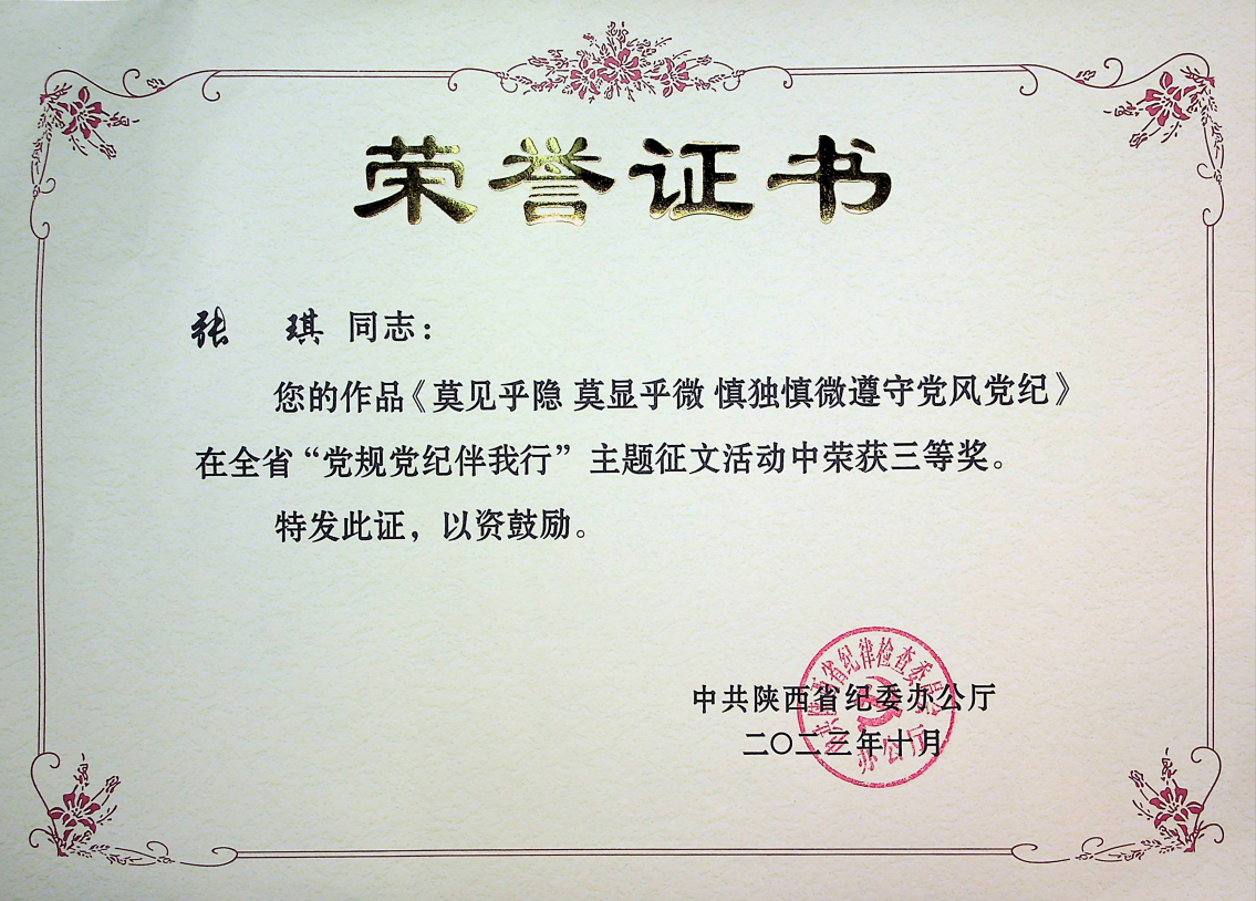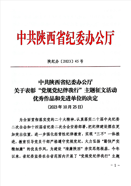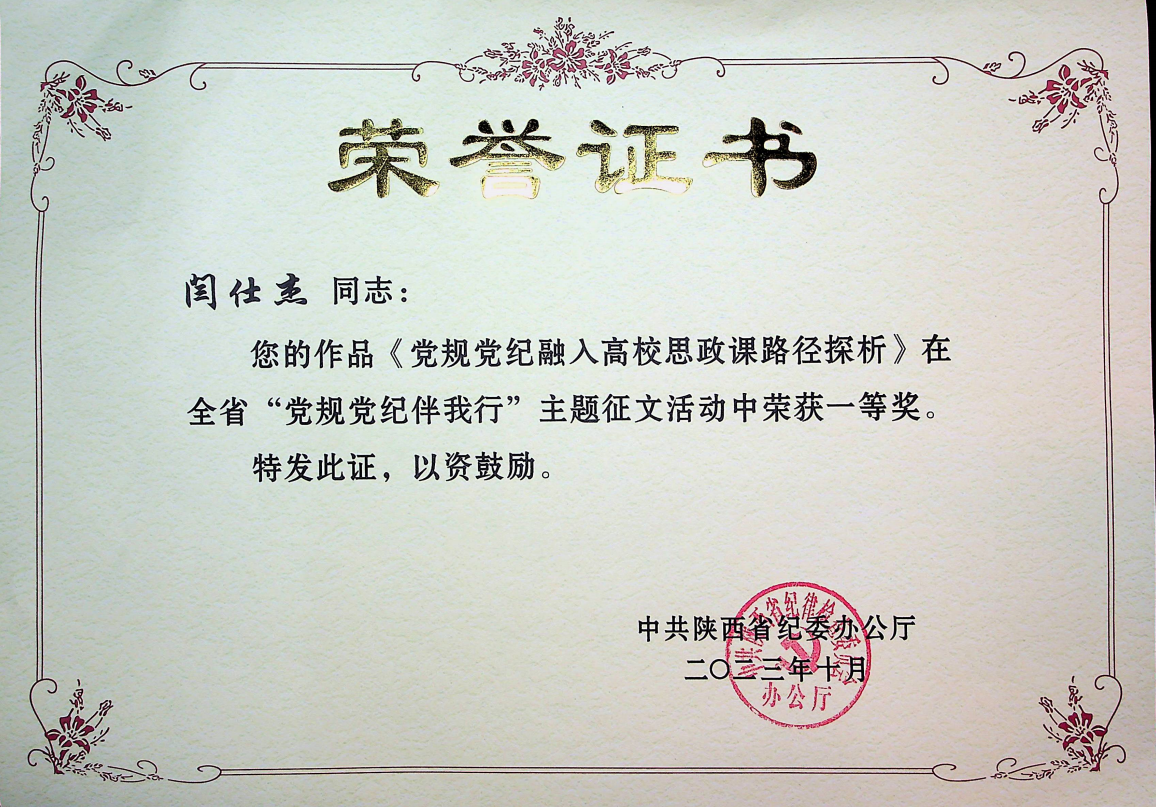 近日,陕西省纪委办公厅发布《中共陕西省纪委办公厅关于表彰“党规党纪伴我行”主题征文活动优秀作品和先进单位的决定》,必赢官网马克思主义学院闫仕杰老师的作品《党规党纪融入高校思政课路径探析》荣获一等奖,电子信息学院张琪老师的作品《莫见乎隐 莫显乎微 慎独慎微遵守党风党纪》荣获三等奖,在省属本科高校中唯一获得一等奖。本次活动在全省范围内征集作品3300余篇,共评选出一等奖作品30篇、二等奖作品50篇、三等奖作品70篇、优秀奖作品150篇。