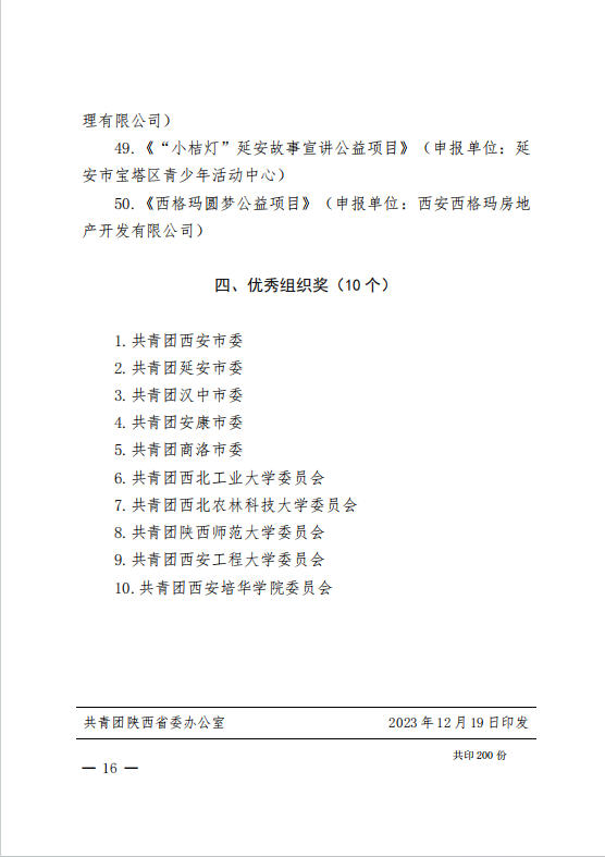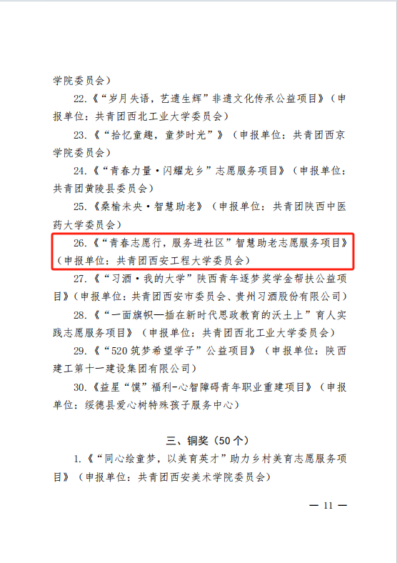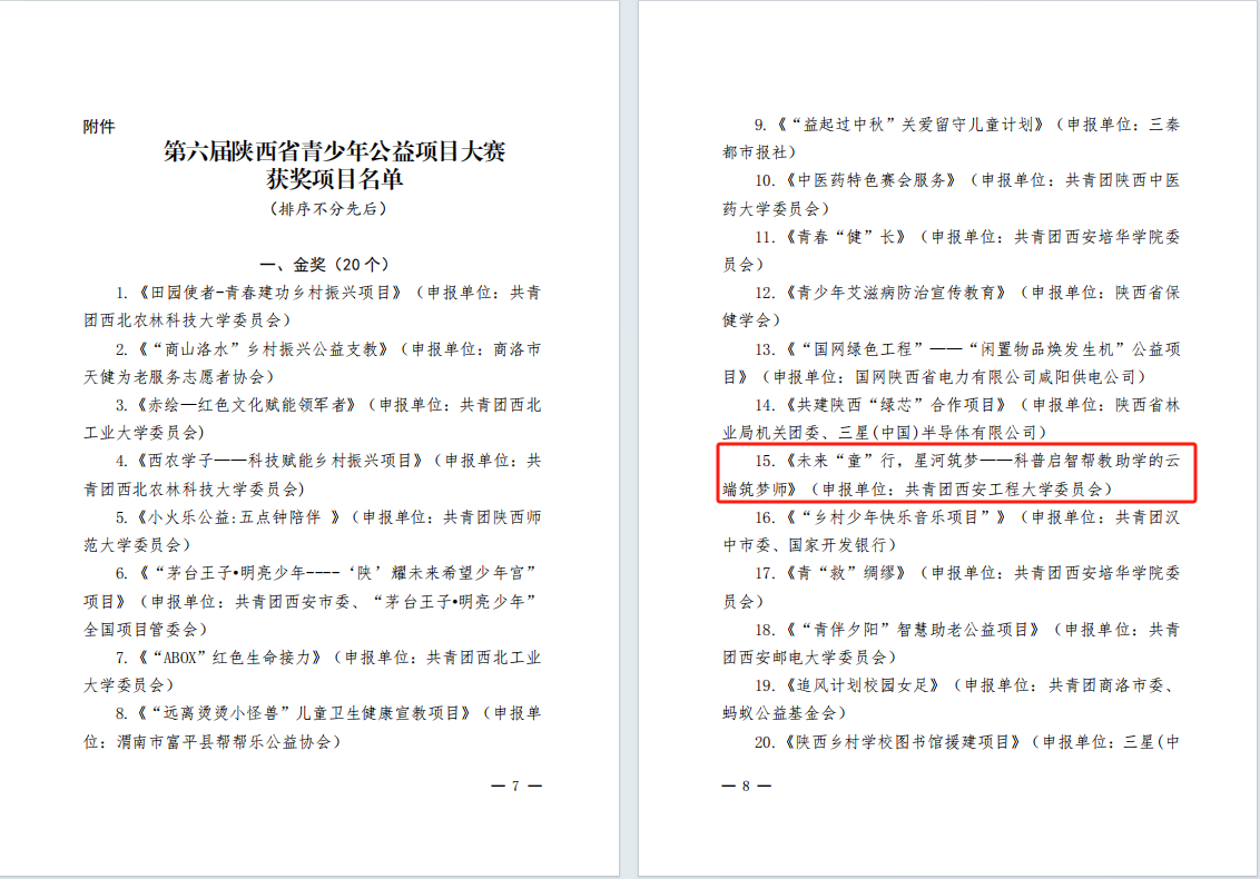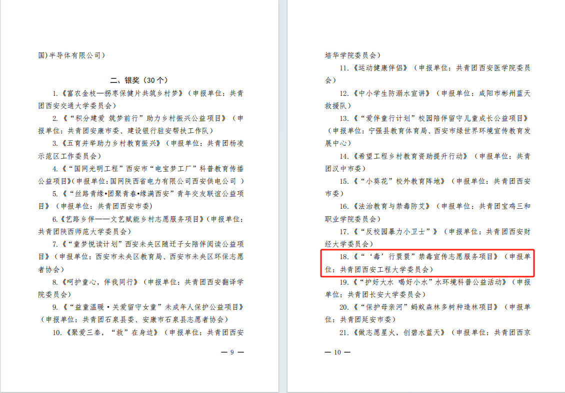 近日,由共青团陕西省委中共陕西省委教育工委中共陕西省委文明办等部门联合举办的“第六届陕西省青少年公益项目大赛”圆满落幕。必赢官网在本次大赛中喜获佳绩,推荐项目《未来“童”行,星河筑梦一一科普启智帮教助学的云端筑梦师》荣获金奖,《“‘毒’行睘睘”禁毒宣传志愿服务项目》《“青春志愿行,服务进社区”智慧助老志愿服务项目》荣获银奖,学校荣获“优秀组织奖”。