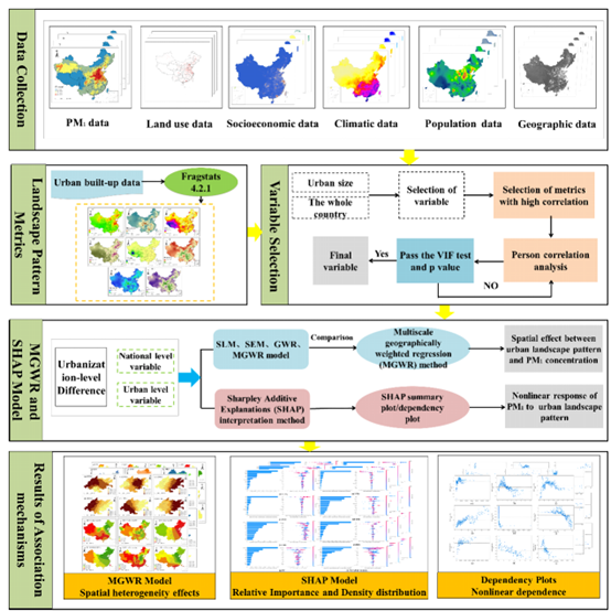 在中国城市景观格局与PM1污染的多尺度关联机制研究方面,张平团队成果表明:城市景观格局与PM1污染密切相关,具有明显的空间异质性。城市建成区无序扩张与不规则的城市形态将加剧PM1污染,而城市破碎化与连通性具有削减作用。分散的景观格局可以有效降低长三角(YRD)、珠三角(PRD)和成渝(CDCQ)地区的PM1浓度,而紧凑且连续的景观指数对缓解京津冀(BTH)和关中平原(GZH)城市群的PM1污染具有积极作用。城市景观格局与PM1污染之间的关系在城市群中体现更强烈。ENN_MN是特征重要性最强和可解释程度最大的景观指数。与其他景观指数相比,城市形状指标与PM1浓度之间的阈值效应关系更复杂。这些关键知识为深入理解PM1污染与景观格局之间的关联机制、城市可持续规划和大气污染调控提供科学依据。该成果以“Investigating the multiscale associations between urban landscape patterns and PM1 pollution in China using a new combined framework”为题,发表于Journal of Cleaner Production(2024,456,142306)期刊上,论文第一作者为我院2021级硕士生朱慧敏,通讯作者为张平博士。