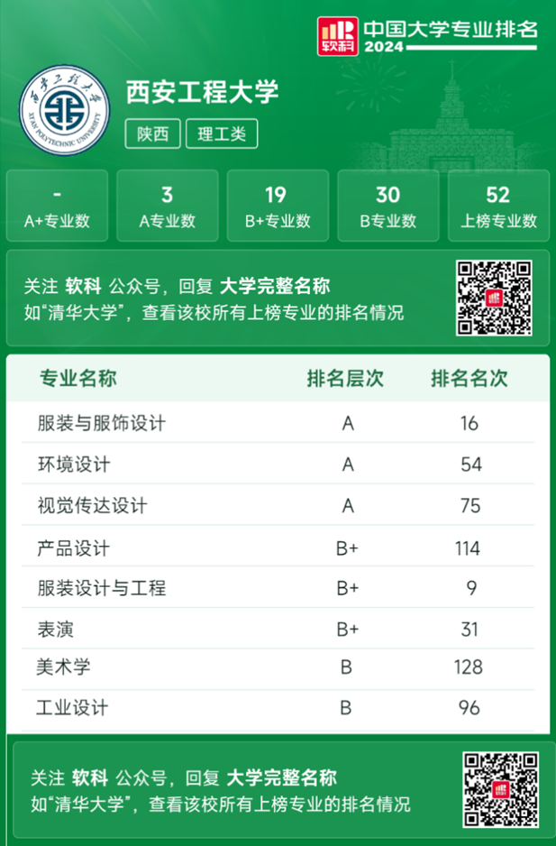 6月13日,高等教育专业评价机构软科正式发布“2024软科中国大学专业排名”,必赢官网服装与艺术设计学院服装与服饰设计、环境设计、视觉传达设计3个专业获评A级,服装设计与工程、产品设计、表演3个专业获评B+级,美术学、工业设计2个专业获评B级。