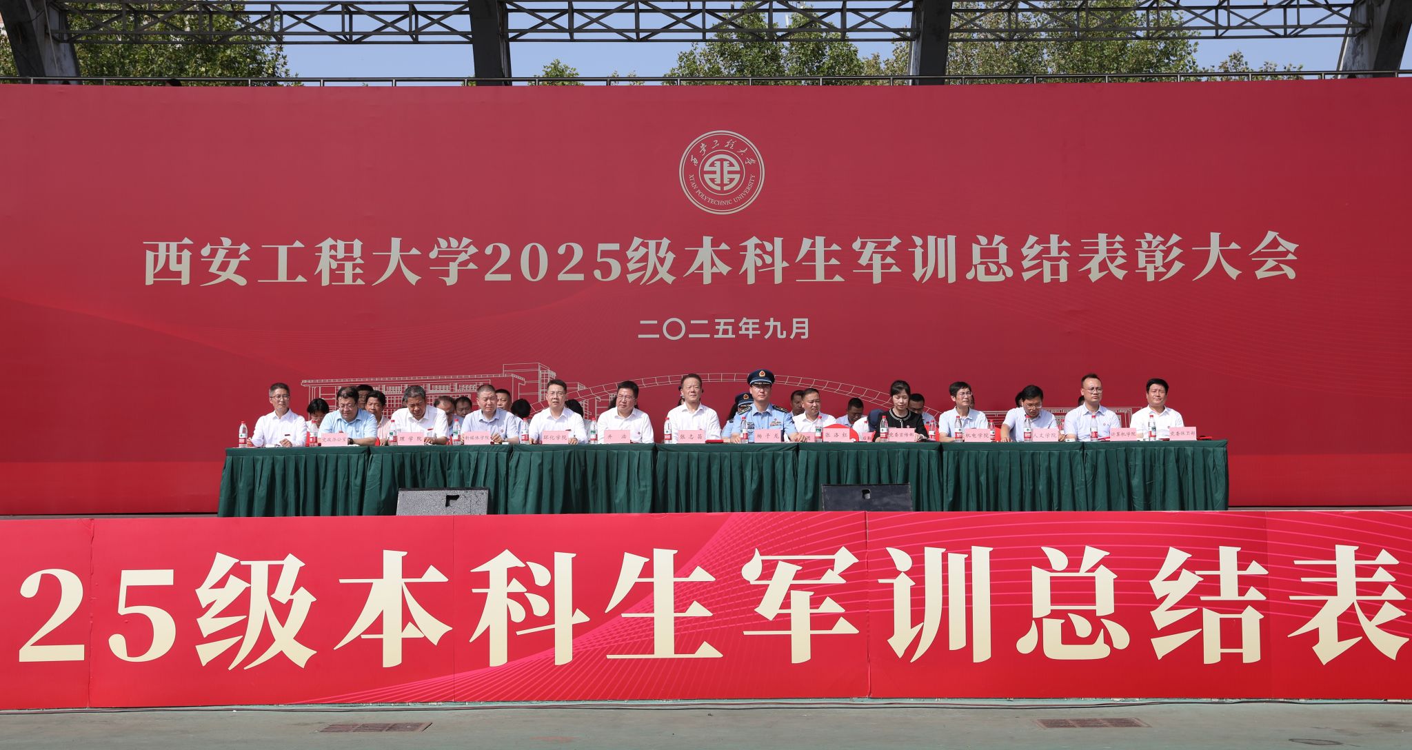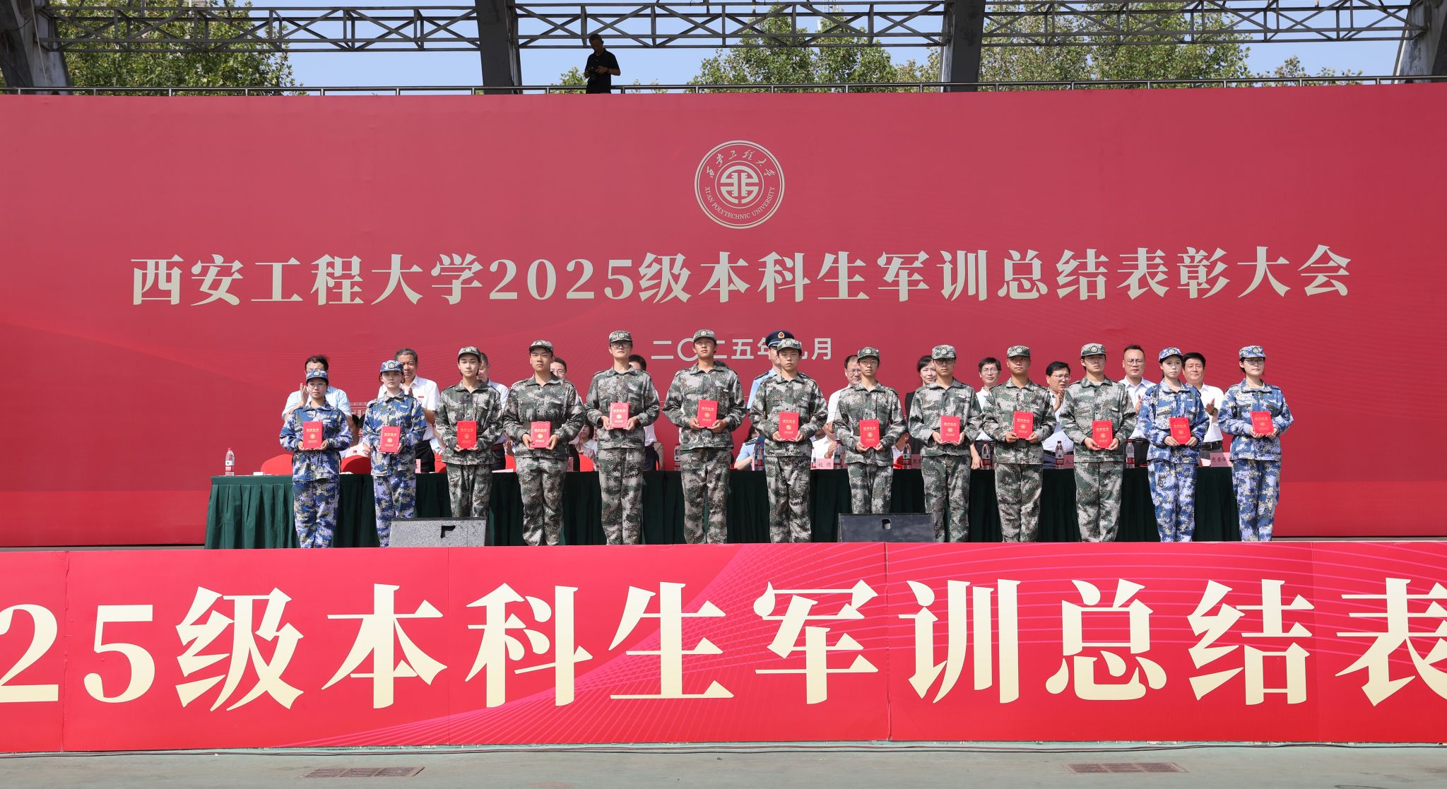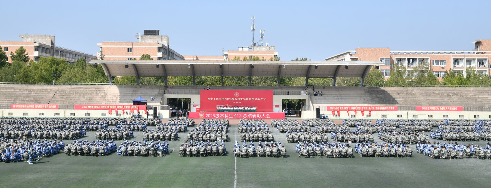 9月14日,必赢官网在临潼校区骊风体育场举行2025级新生军训总结表彰大会。校党委书记张志昌、校党委副书记井浩、副校长张洛红出席表彰大会。校国防教育暨学生军训领导小组各成员单位负责人、各学院党委书记、军训旅各团政委、军训办公室成员、全体承训教官、军训辅导员和4083名本科新生参加大会。