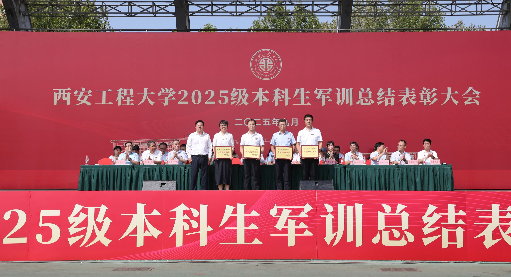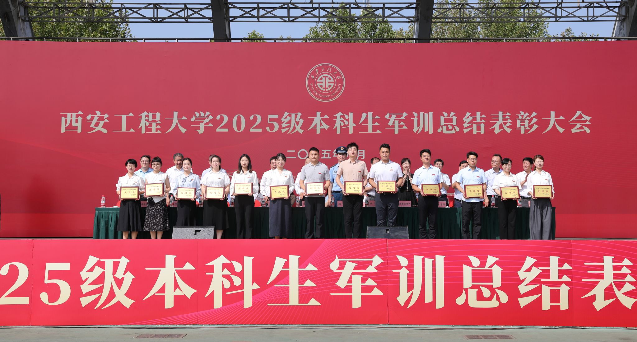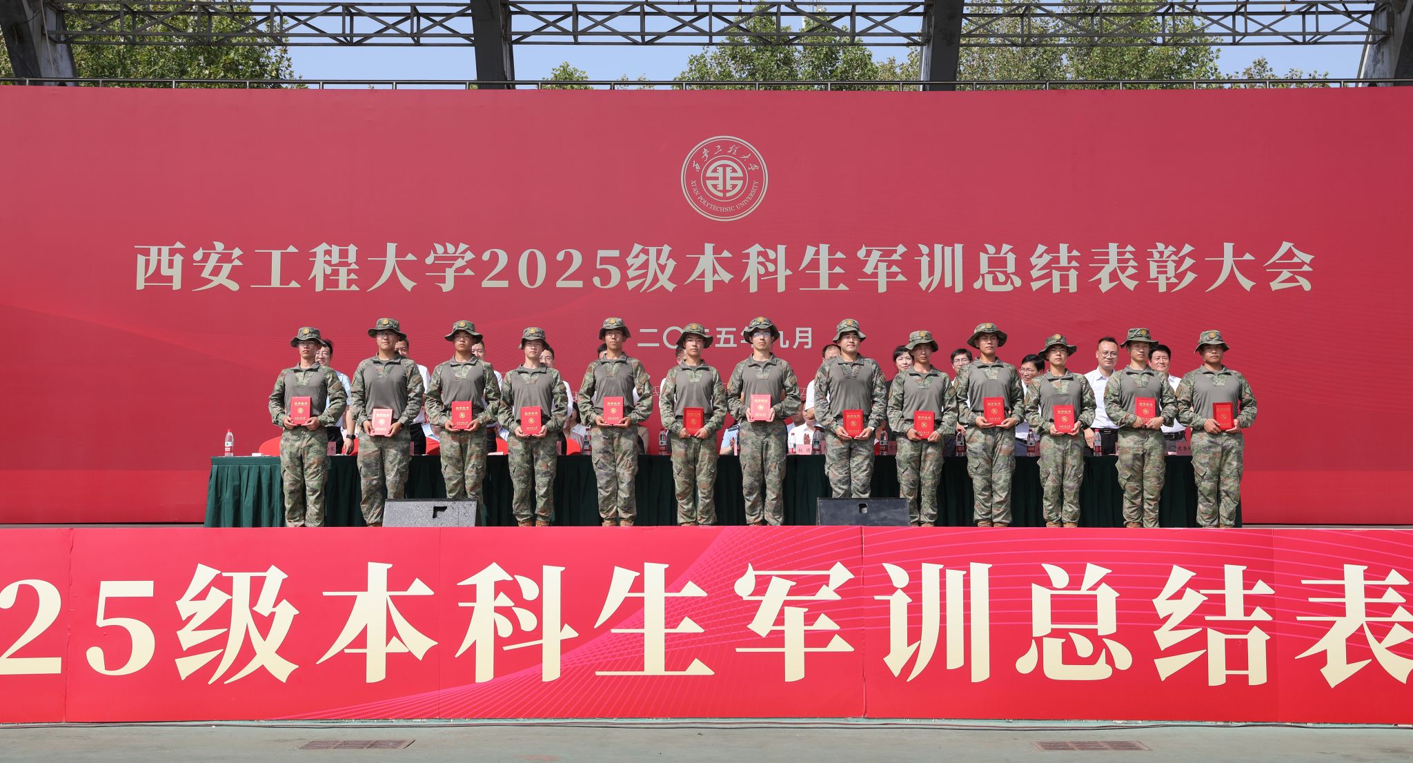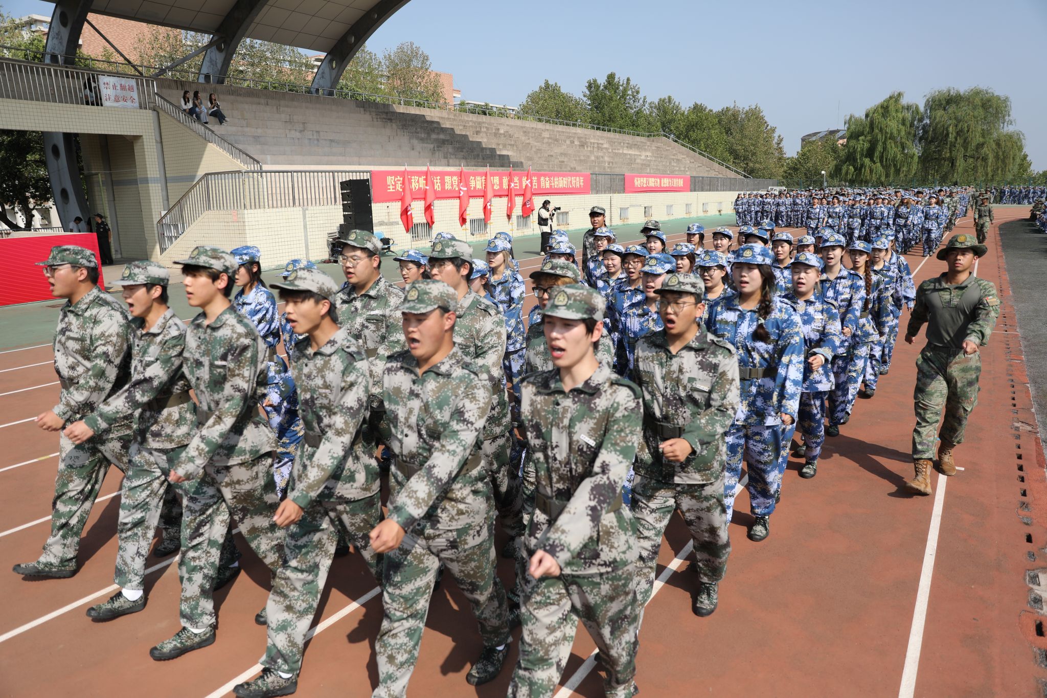 9月14日,必赢官网在临潼校区骊风体育场举行2025级新生军训总结表彰大会。校党委书记张志昌、校党委副书记井浩、副校长张洛红出席表彰大会。校国防教育暨学生军训领导小组各成员单位负责人、各学院党委书记、军训旅各团政委、军训办公室成员、全体承训教官、军训辅导员和4083名本科新生参加大会。
