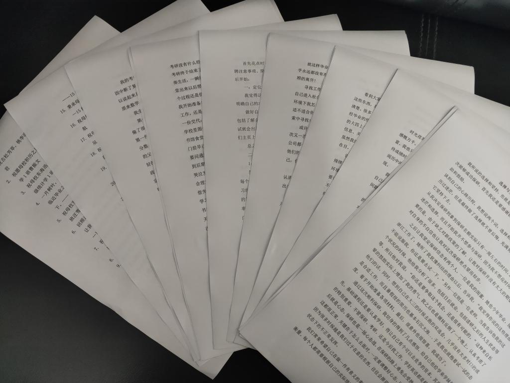 二是开展考研、求职心路历程征文活动。理学院在6月份组织考研同学和求职同学参与了征文活动,学院择优进行了宣传推广,向低年级同学进行了分享,希望低年级同学们以优秀毕业生为榜样,在学习生活上不断进步。