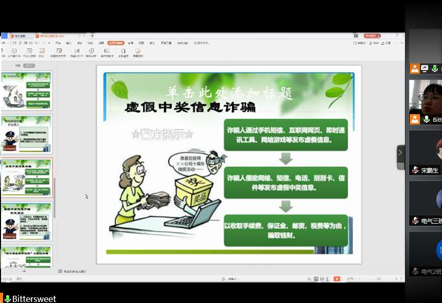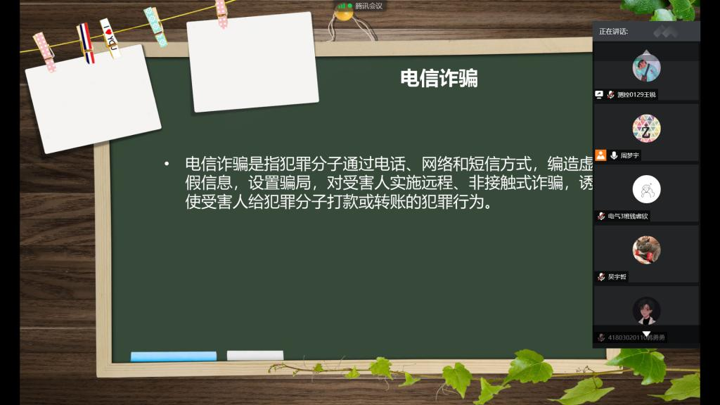 为进一步提升电子信息学院学生防诈骗意识,增强防诈骗能力,2018年6月,电子信息学院2018级、2019级所有班级通过线上手段开展防诈骗安全教育主题班会。