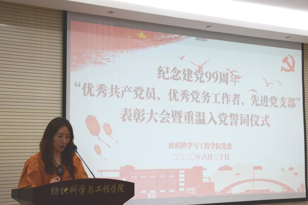 本次庆祝建党99周年表彰大会暨重温入党誓词仪式,旨在激励广大党员全身心投入学院发展的积极性、主动性和创造性,进一步增强党员干部和师生的责任担当,鼓舞他们坚定信心,以更加自觉的行动将对党的忠诚转化为建设一流纺织学院的强大动力,主动投身于学院建设和发展的工作实践中去。(撰稿:苏娜;审核:胡小进)