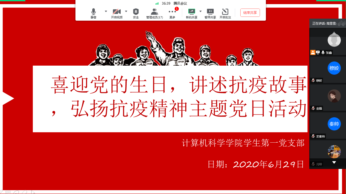 6月29日,支部又在线上开展“喜迎党的生日,讲述抗疫故事,弘扬抗疫精神”主题党日活动。疫情发生以来,全国上下齐心协力、同心同德,共同抗击疫情,涌现出许多可歌可泣的感人故事。有无私奉献、舍小家顾大家、日夜坚守在抗疫一线的白衣天使;有主动请缨驰援武汉的上万“逆行英雄”;还有无数积极捐款捐物的爱心人士……在分享的过程中,支部党员或结合身边人身边事,从细小处挖掘抗疫故事,或从媒体宣传的抗疫英雄事迹着手,进行事迹分享,汲取到了源源不断的抗疫精神养料。