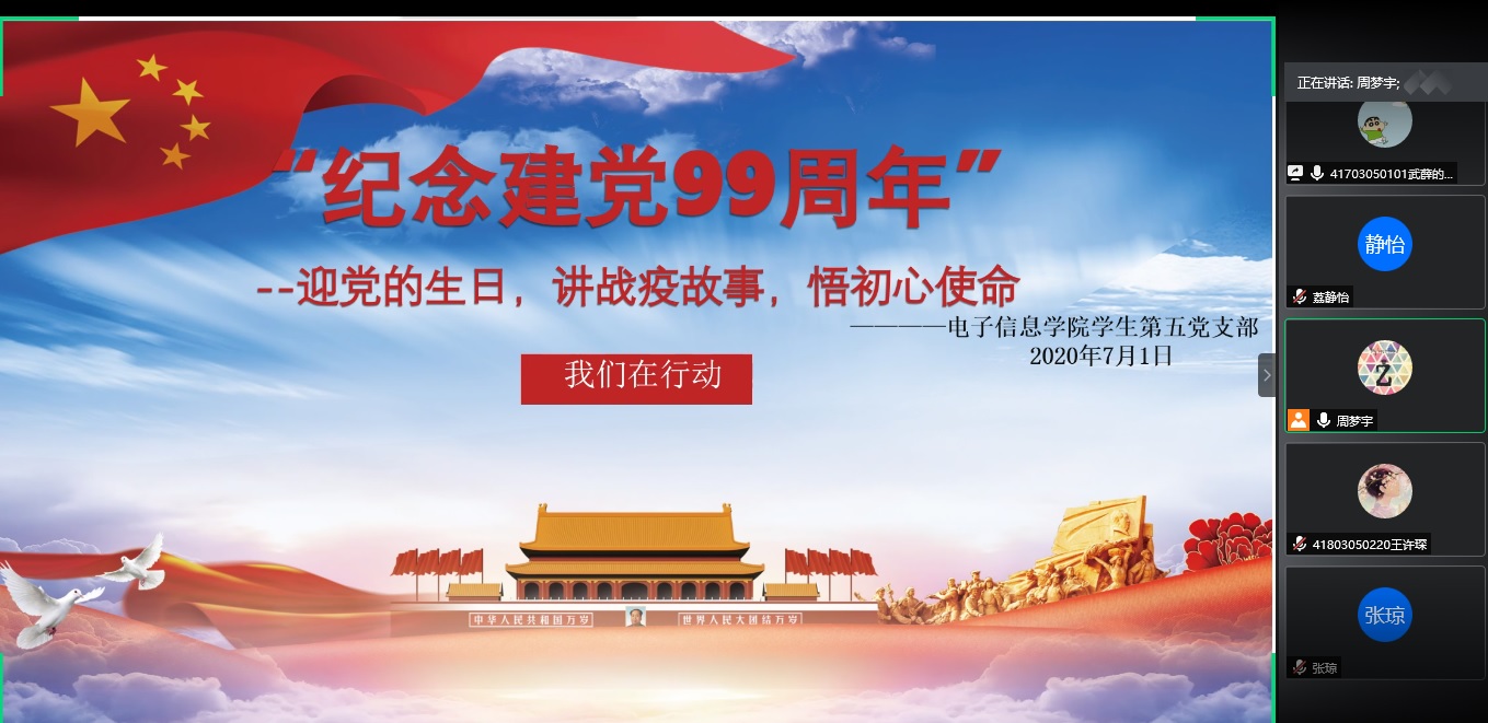 为迎接中国共产党建党99周年,提高支部党员初心与使命的责任感。7月1日下午,电子信息学院学生第五党支部开展学习“庆祝建党99周年”专题学习会。会议由支部书记周梦宇主持,会议支部全体党员参加此次线上会议。