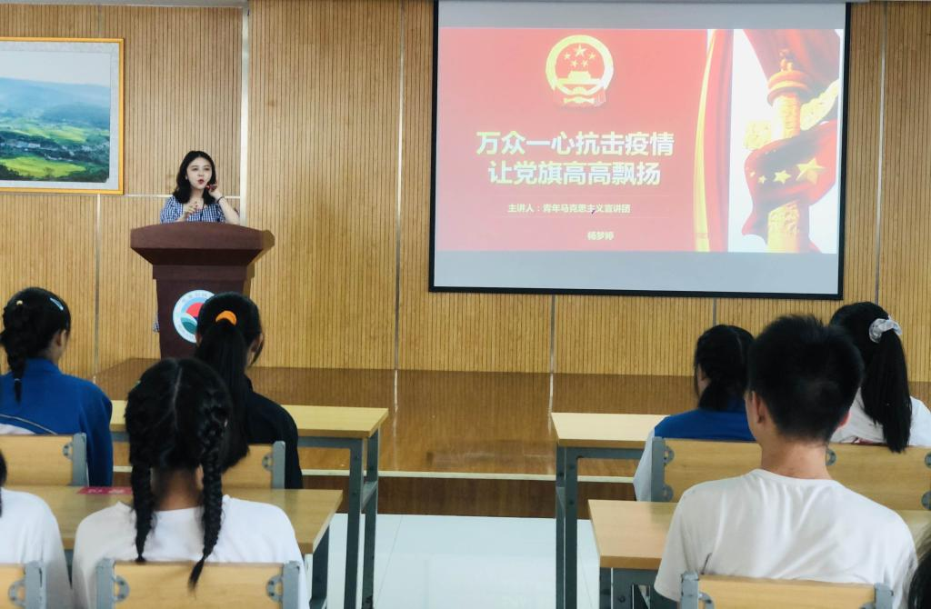 2020年7月2日下午,必赢优惠y272net马克思主义学院青年马克思主义理论宣讲团成员赴安康市岚皋县花里中学开展的“共抗疫情,爱国力行”主题宣讲活动,花里中学副校长张永贵、教务处主任张威明、党支部副书记汪辉、团支部书记李双双及全体初中生参加了此次活动。