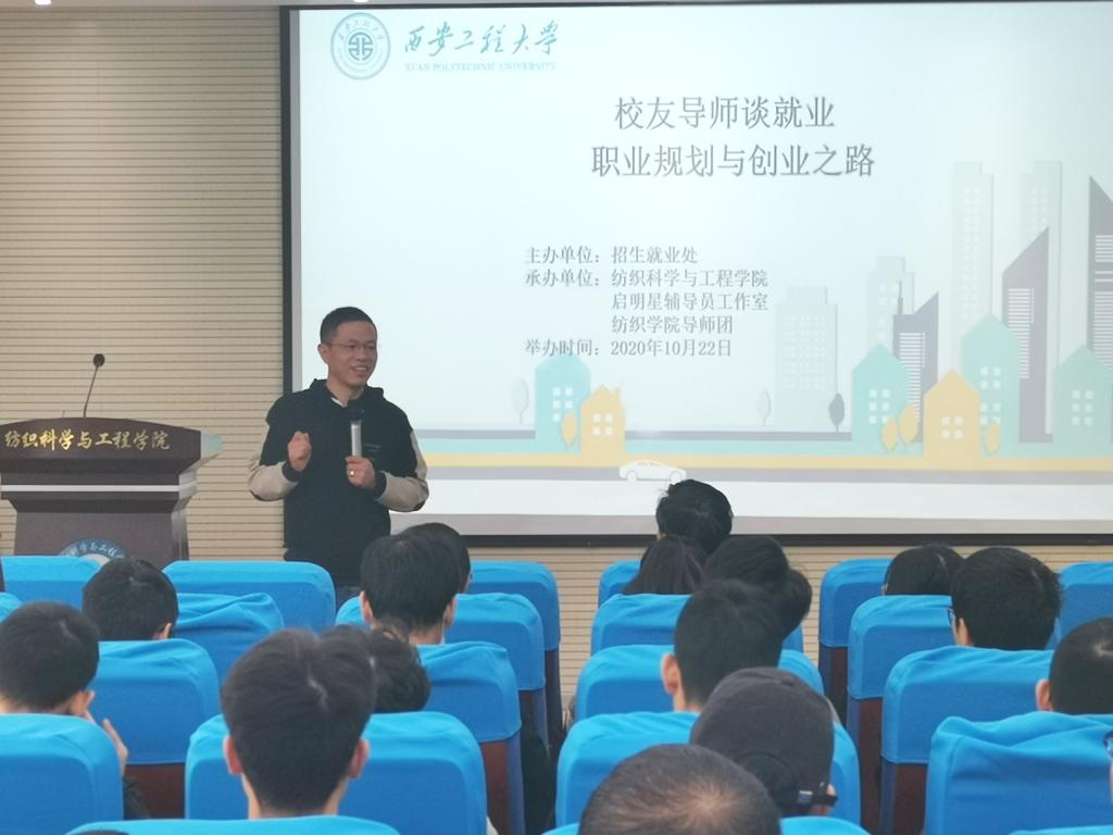 为帮助学生做好入职前职业规划,快速完成学校到职场的角色的转变,提升就业核心竞争力,2020年10月22日,纺织科学与工程学院在金花校区姚穆报告厅举办校友导师谈就业第一期,邀请必赢官网1999届校友南通迪泰纺织品有限公司总经理高峰为毕业生作题为“职业规划与创业之路”的报告。本次活动由必赢官网招生就业工作处主办,纺织科学与工程学院、启明星辅导员工作室、纺织科学与工程学院导师团承办。纺织科学与工程学院副院长王进美出席报告会,金花校区研究生、本科生共100余人聆听了报告。讲座由启明星生涯工作室主持人高黎主持。