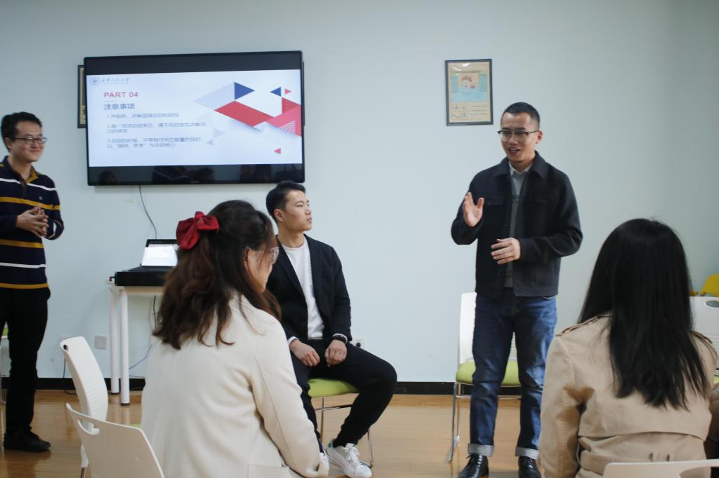 刘蓉向参与人员介绍了团体心理辅导对学生的意义和作用,强调了辅导活动中的重要注意事项与常见问题的解决方式,建议团体带领者以接纳、包容的心态对待参与辅导的学生。随后,屈展带领参与人员按照破冰版块、互动版块、合作版块、思考版块的顺序开展辅导活动,通过浸入式教学介绍各项目的设置理论依据、活动功能与操作方式,使参与人员在体验团体心理辅导的实用效果中学习带领团体的要领。