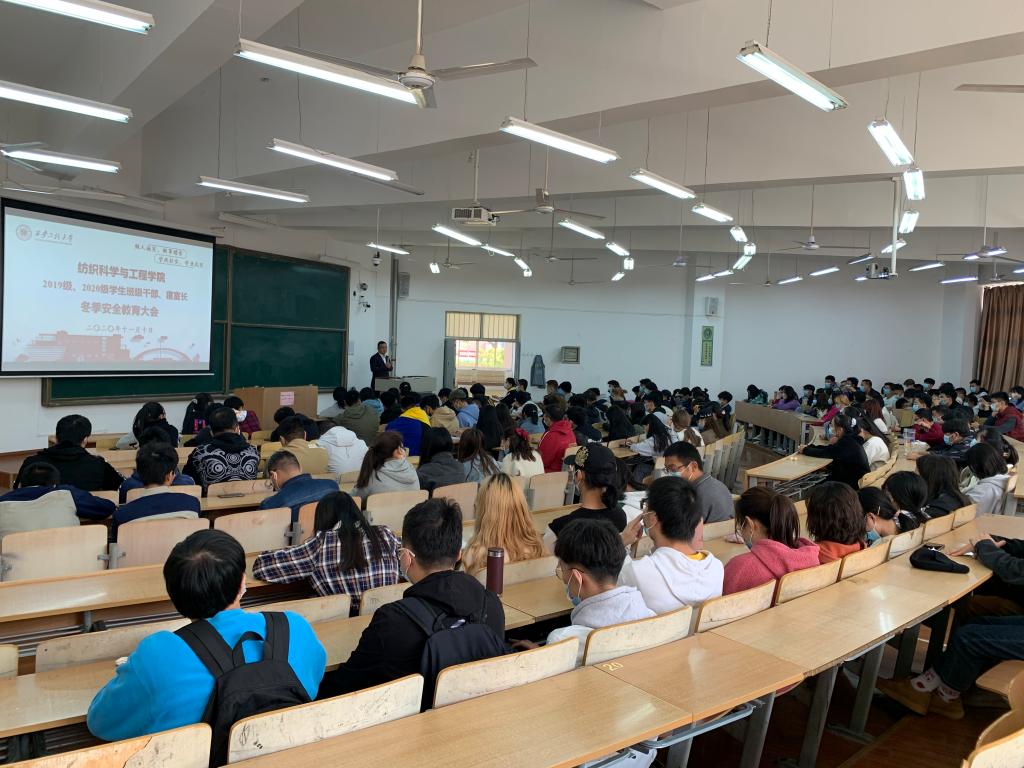 为提升学生冬季安全防范意识,加强安全教育知识宣传,2020年11月10日,纺织科学与工程学院三全育人导师团和团总支在临潼校区B-133教室举办学生班级干部、寝室长冬季安全教育大会。学院学生工作办公室主任、轻化工程导师团秘书赵勇进,2019级辅导员、纺织工程第二导师团秘书苏娜,2020级辅导员、纺织工程第一导师团秘书曹鑫,2019级及2020级全体学生班委、寝室长参加会议。