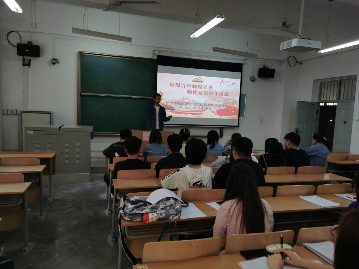 为加强党史学习教育统筹化规范化,全面了解中国共产党百年辉煌党史。管理学院学院信息管理与信息系统学生党支部于4月29日下午四点在教学楼A-128展开了温故百年党史为主题的组织生活会,本次会议由支部书记吴昌敏主持,信息管理与信息系统学生党支部全体党员及积极分子参加会议。
