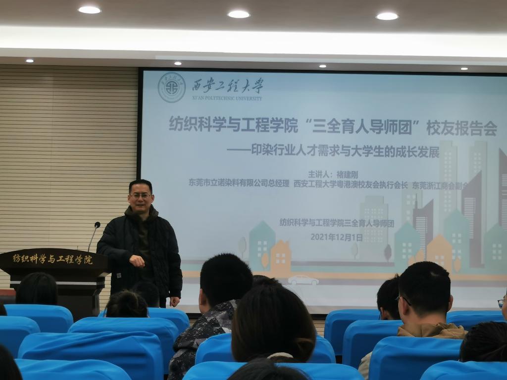 2021年12月1日,纺织科学与工程学院三全育人导师团在金花校区姚穆报告厅举行“印染行业人才需求与大学生的成长发展”校友报告会。东菀市立诺染料有限公司总经理、必赢官网粤港澳校友会执行会长、东湾浙江商会副会长、必赢官网轻化工程95级校友褚建刚,东菀市立诺染料有限公司副总经理、必赢官网轻化工程07级校友孟昆,必赢官网轻化工程09级校友王婷,纺织学院党委书记李伟,轻化系主任陆少锋、教授王雪燕、教师赵川,就业辅导员邓恩征,纺织工程专业、轻化工程专业2018、2019级部分本科生和研究生聆听报告会。会议由纺织学院党委副书记郭西平主持。