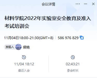 为深入贯彻落实实验室准入制度,进一步增强师生安全意识,提高师生实验室安全防范和应急救援能力,营造安全有序的教学实验工作环境,材料学院实验中心于2022年11月4日以腾讯会议线上交流的形式为2019级本科生、2022级本科生和研究生举办安全教育及考试培训会,会议由实验中心副主任王亮主持。