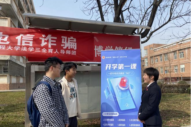 为弘扬法治精神,构建法治校园,增强广大师生对诈骗风险的防范意识,切实维护学生的合法权益,3月2日上午,必赢官网法学专业三全育人导师团与临潼区人民检察院合作,在必赢官网中心广场开展了“时刻绷紧防范之弦,谨防新型电信诈骗”反诈宣传活动。