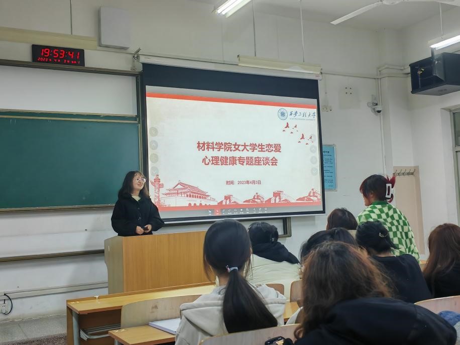 为加强大学生心理健康教育,引导学生树立正确的恋爱观念,尤其是提高女生在恋爱关系中的自我保护意识,4月3日晚,材料工程学院组织开展大学生恋爱心理健康座谈会。会议由学院辅导员杨早宁老师主持,学院21、22级全体女生计60余人参加。