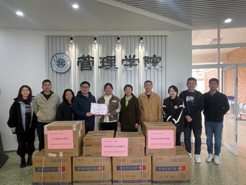 4月6日,管理学院2020级人力资源管理专业学生邓亚男向学校捐赠了一批防护物资。国内合作与校友工作处处长郭可义、管理学院党委书记王爱华代表学校接收了捐赠物资。