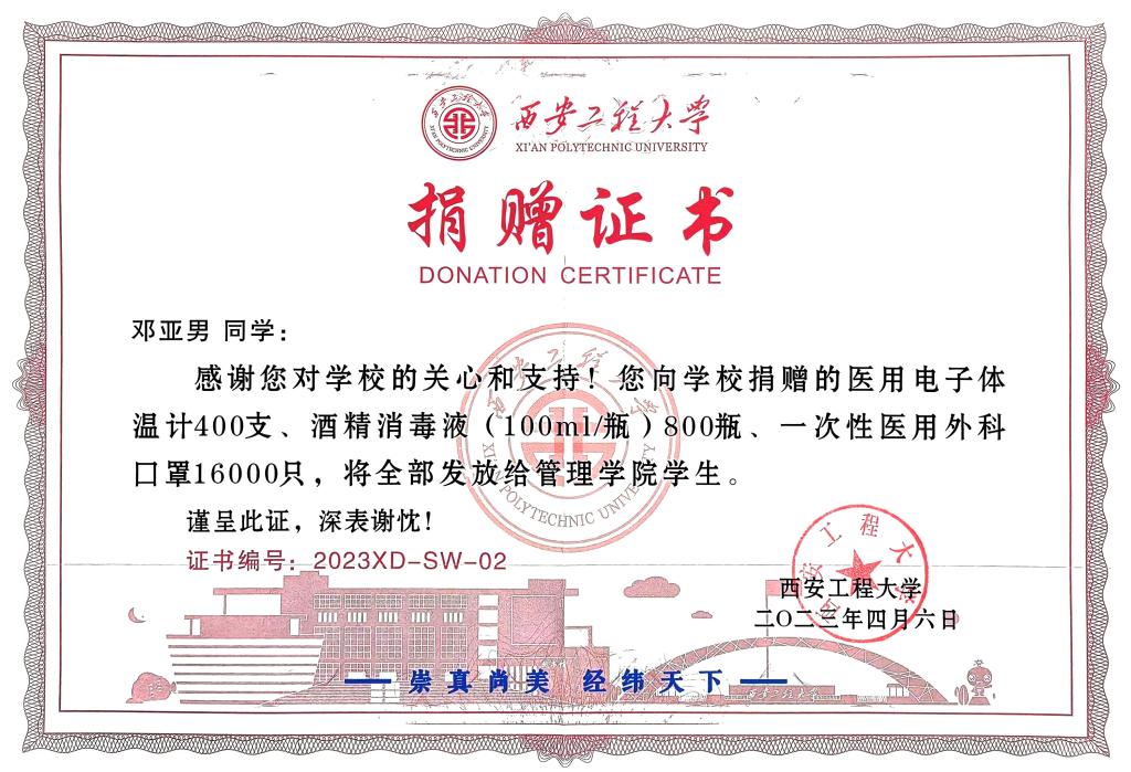 郭可义对邓亚男表示感谢,并代表学校向她颁发了捐赠证书。郭可义提到,邓亚男不仅在疫情期间积极投身学校疫情防控工作,还能时刻考虑学校和同学们的实际需求,提供力所能及的帮助,充分彰显了青年学生的责任担当。这批物资会尽快发放给在校学生,将这份爱心和温暖传递给同学们,也将爱校荣校、无私奉献的精神传递给大家。