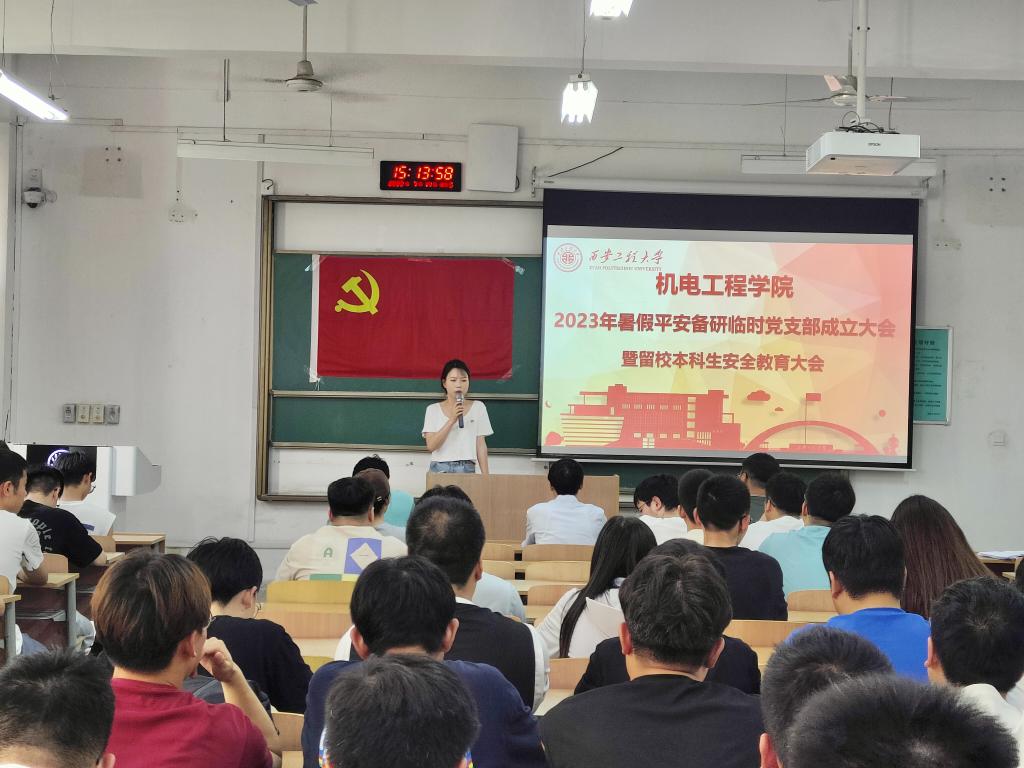 7月14日下午,机电工程学院召开2023年暑假平安备研临时党支部成立大会暨留校本科生安全教育大会,院党委书记阚佩、党委副书记冯翊、辅导员刘鹏和留校学生参加了此次会议,会议由2020级辅导员李菁菁主持。