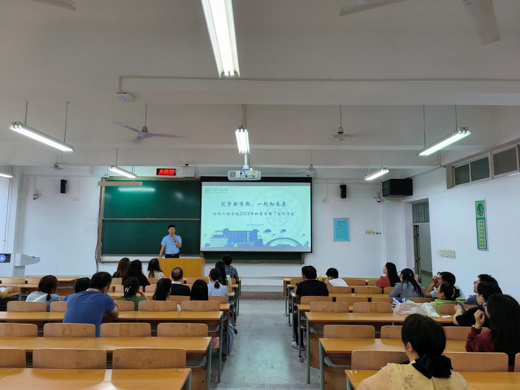 为更好增强家庭与学校之间相互了解,建立好家校联系长效机制,实现家庭教育与学校教育的有机结合,8月26日下午,材料工程学院举办2023级“家长学校”活动。学院院长贺辛亥、教务员张贺檬、学工办副主任常传旭、2023级本科生辅导员杨早宁、2023级本科新生家长共计90余人参加了此次活动。活动由常传旭主持。