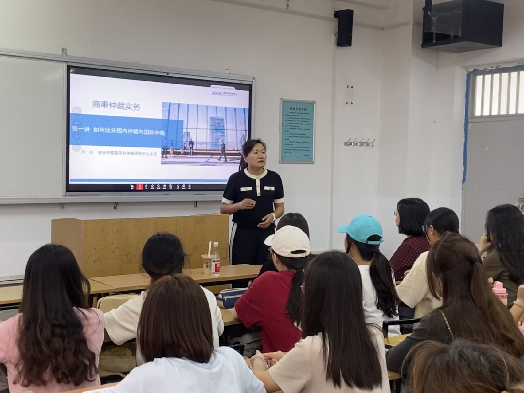 刘红主任先是讲述了仲裁在国内外的发展历史,详细介绍了我国仲裁委员会的性质、职能和基本原则,让学生对仲裁有了基本的认识。接着用自己在仲裁委员会中接触的案例,引发学生对于仲裁规则的思考,加深学生对仲裁这种争议解决方式的理解。用其自身丰富的实务经验为同学们打开了兴趣之门,带领同学们踏上仲裁的领域,在法律道路上越走越远。