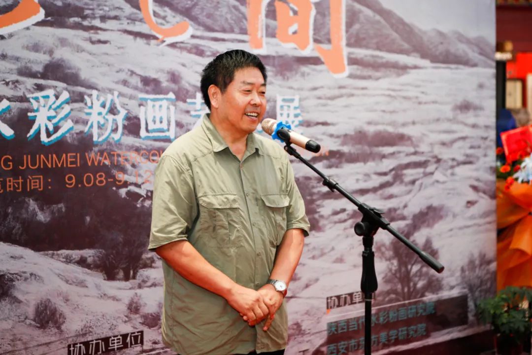 开幕式上,巨石、蔺宝刚、史涛在开幕式现场分别致辞,他们对学校支持陕西美术行业发展表示感谢,对曾军梅画作的立意和表现手法予以充分肯定,倡导广大水彩画家们以人民为中心进行创作,不断推出反映时代主题的佳作,为弘扬中华优秀传统文化贡献力量。吕钊致辞并宣布开幕,他表示,曾军梅老师长期耕耘在教学科研一线,本次水色之间画展出100余幅作品是她近年来的精品力作,是她讴歌美好生活,颂扬祖国的大好河山和建设面貌的真情流露。她的作品倾注了写实的力量,非常难能可贵。