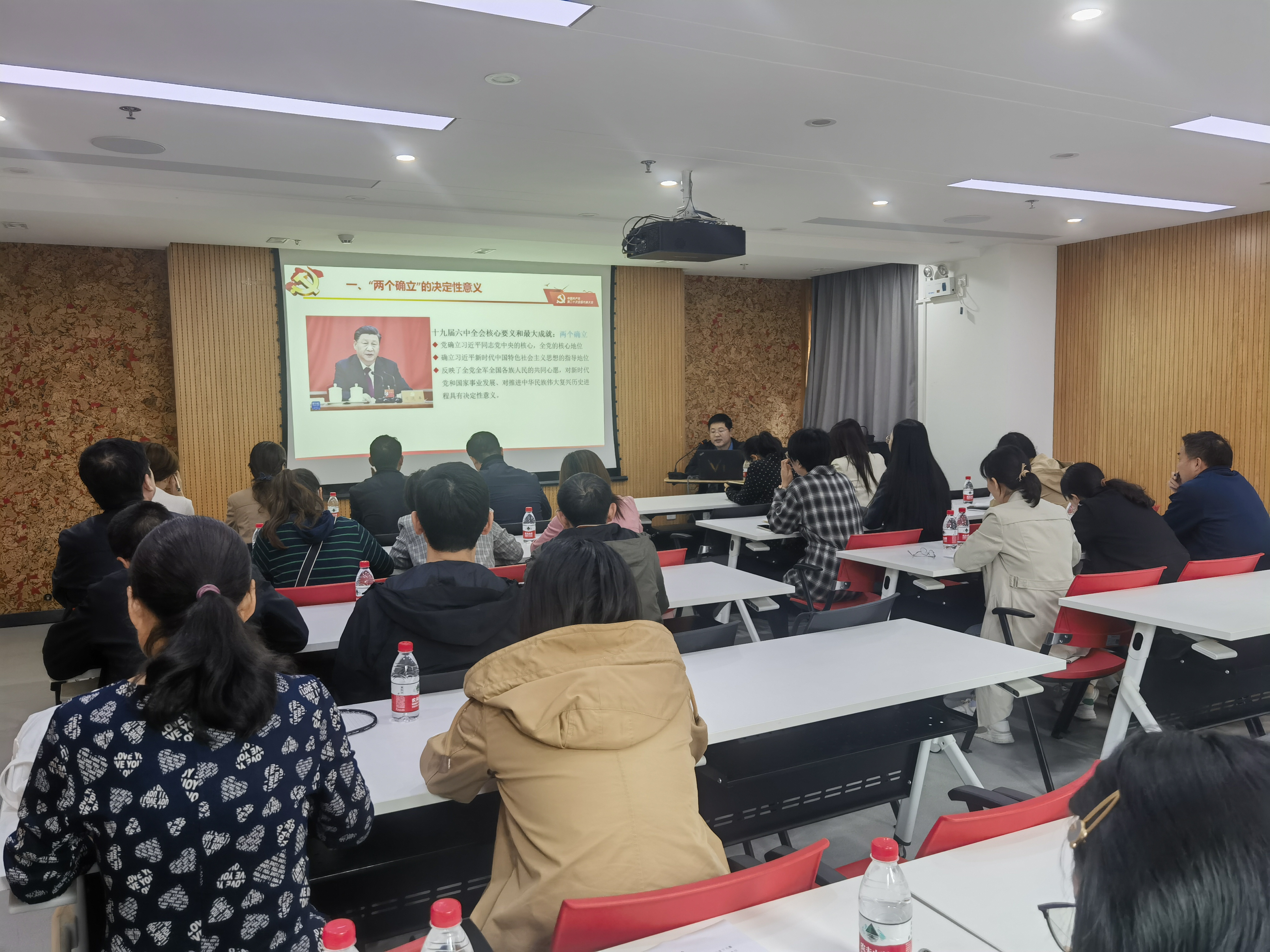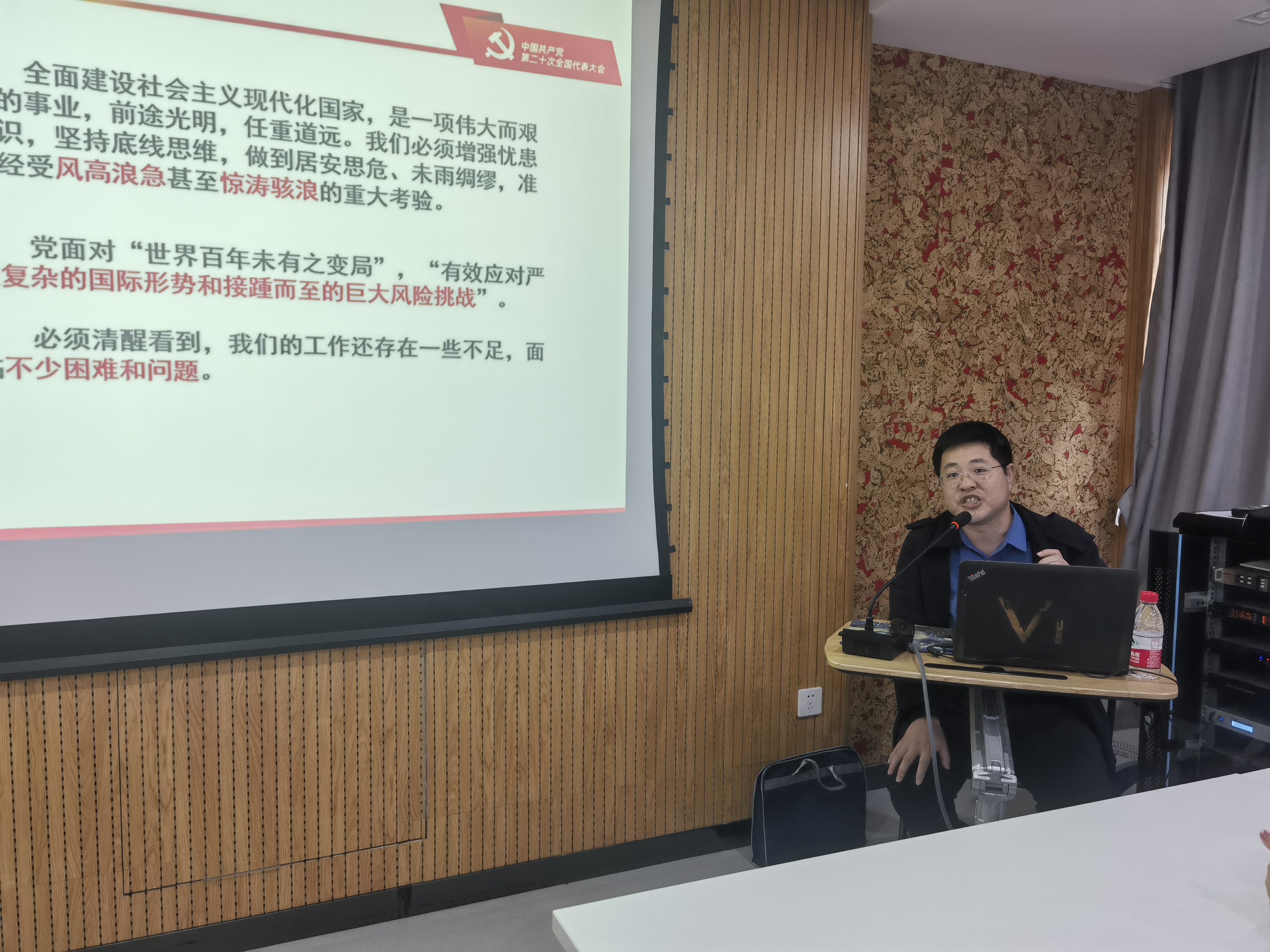 郭松教授从“两个确立”的决定性意义讲起,通过深刻分析世界百年未有之大变局下党和国家事业发展所面临的形势任务、中华民族伟大复兴战略全局中所面临的机遇挑战以及中国共产党面临的风险考验,让大家清醒的认识到,全面建设社会主义现代化国家,是一项伟大而艰巨的事业,必须增强忧患意识,坚持底线思维,做到居安思危、未雨绸缪,准备经受风高浪急甚至惊涛骇浪的重大考验。广大党员要正确认识党和人民事业所处的历史方位和发展阶段,深刻领悟“两个确立”的决定性意义,准确把握新时代新征程党的中心任务,坚定不移把“两个确立”真正转化为坚决做到“两个维护”的思想自觉、政治自觉、行动自觉。随后,郭松教授从“十个明确”“十四个坚持”“十三个方面成就”为我们解读习近平新时代中国特色社会主义思想的精髓要义和实践要求,并号召全体党员要常补精神之钙,坚定正确政治方向;常筑理论之基,贯彻实事求是的思想路线,常谋振兴之策,增强创新创业行动力;常怀为民之心,增强政治立场践行力;常树底线意识,营造风清气正政治生态。