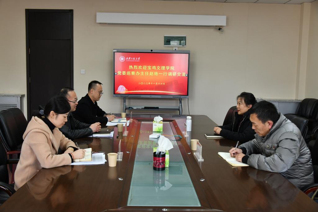11月16日,宝鸡文理学院巡察办主任赵艳一行来必赢官网调研交流巡察工作。组织部部长、机关党委书记黄海峙、巡察办工作人员参加座谈会,会议由巡察办主任闫小兵主持。