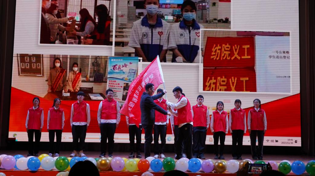 李伟代表学院党委向“梦桃青年志愿者服务队”授旗,服务队举行了新队员入队仪式,并庄严宣誓。他们承诺“尽己所能,不计报酬,帮助他人,服务社会。践行志愿精神,传播先进文化,为建设团结互助、平等友爱、共同前进的美好社会贡献力量。”